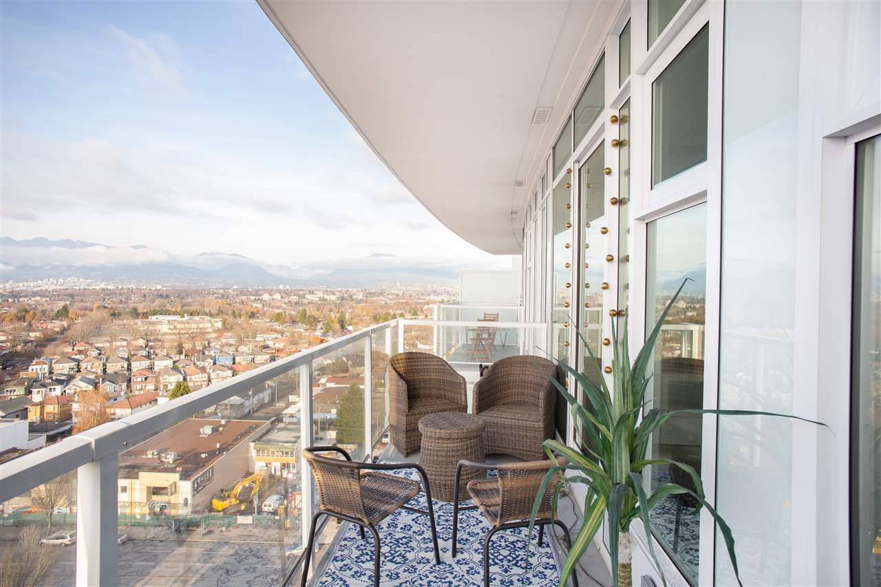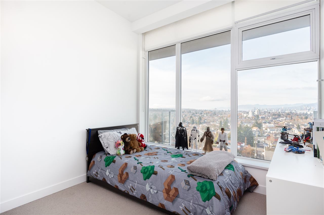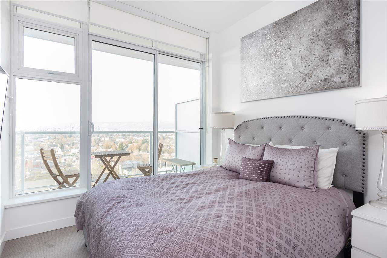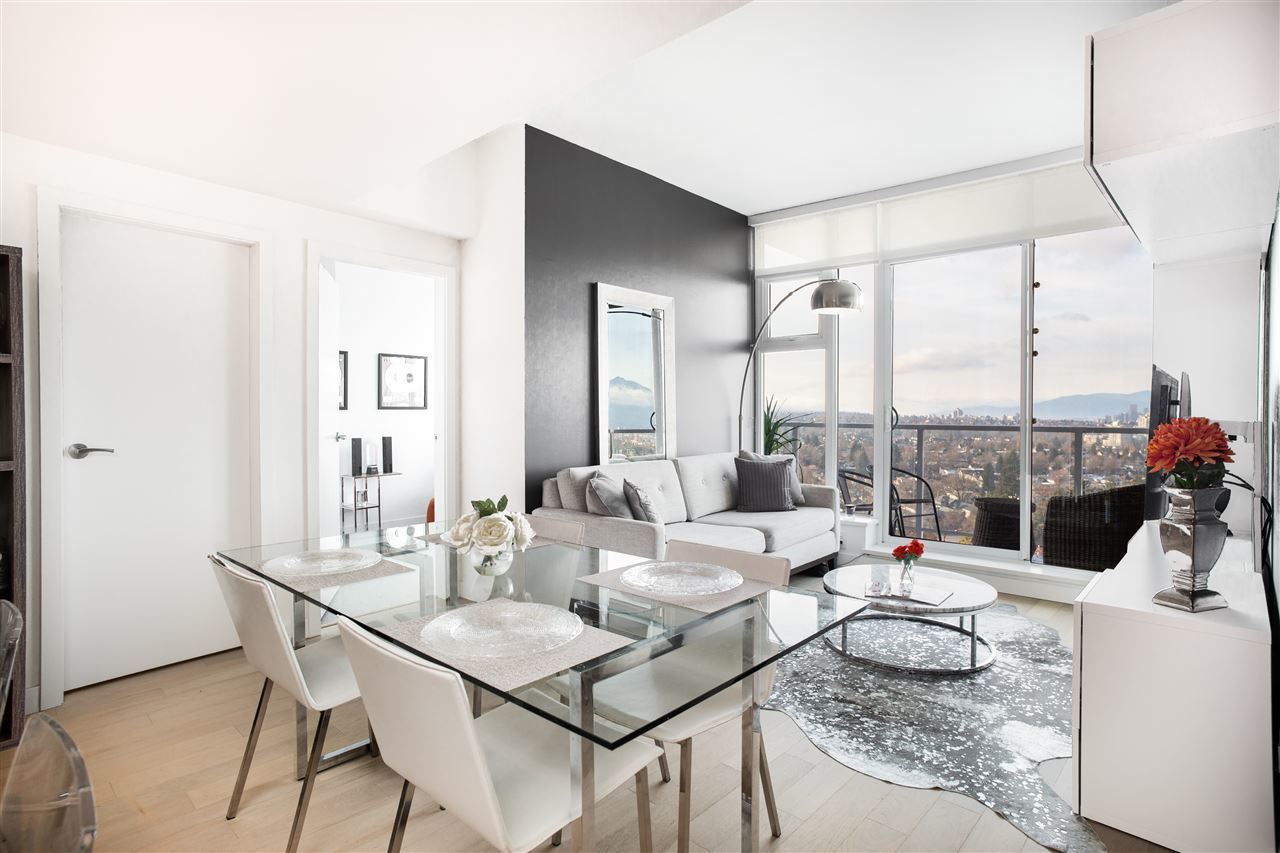 Sub-Penthouse at Kensington Gardens by Westbank! Enjoy world-class views of the City skyline, water & NS Mntns from this nearly 1000 sqft 3 bed + den executive home. This intelligently designed air-conditioned interior features wide-plank engineered hw floors, durable Corian counters, imported European cabinetry, Blomberg/Miele s/s appliance package incl side-by-side refrigerators, b/in wall oven, eating bar & sleek undercabinet lighting. This master-planned community features amazing hotel-style experience incl outdoor pool, hot tub, sauna, exercise facility, party room, theatre, outdoor BBQ/fireplaces, & playground. Complete with 2 side-by-side parking, 1 locker. Don't miss your chance to watch iconic Vancouver sunsets from your 2 completely private balconies!