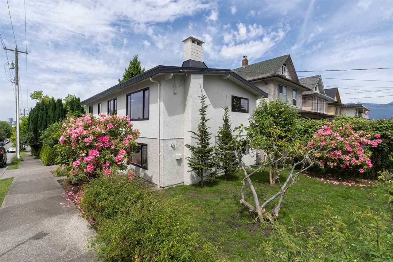 Completely remodeled Vancouver Special with modern contemporary flair. Perched high on corner across from park on a 33x99ft lot with private fenced yard. Open concept main floor with large windows & skylights to bring in an abundance of light. Kitchen with deluxe appliance package including gas stove & quartz counters. Deck off kitchen perfect for summer bbqs. Spacious living area with wood burning fireplace & wide plank oak flooring. 3 bedrooms including master with ensuite & Nuheat flooring in all bathrooms. Executive 2 bedroom suite also with wood burning fireplace. Extra large 1 car garage, new roof, new windows. RM-3A zoning allows for six storey rental building. Super Hastings Sunrise location across from Pandora Park, steps to Hastings Village & only a quick drive to downtown.