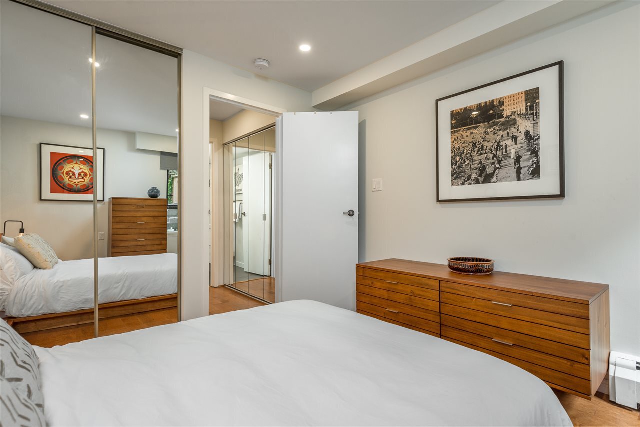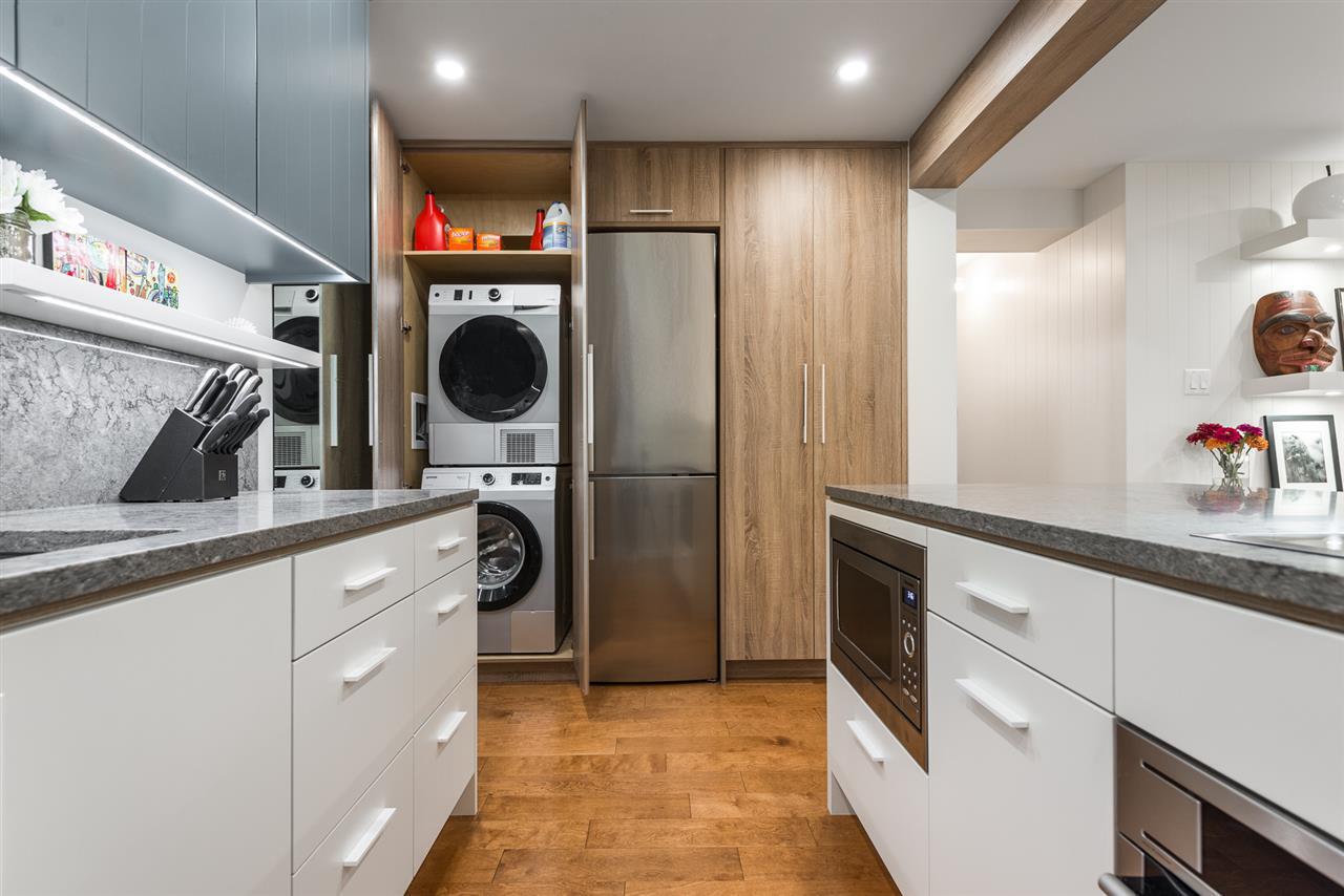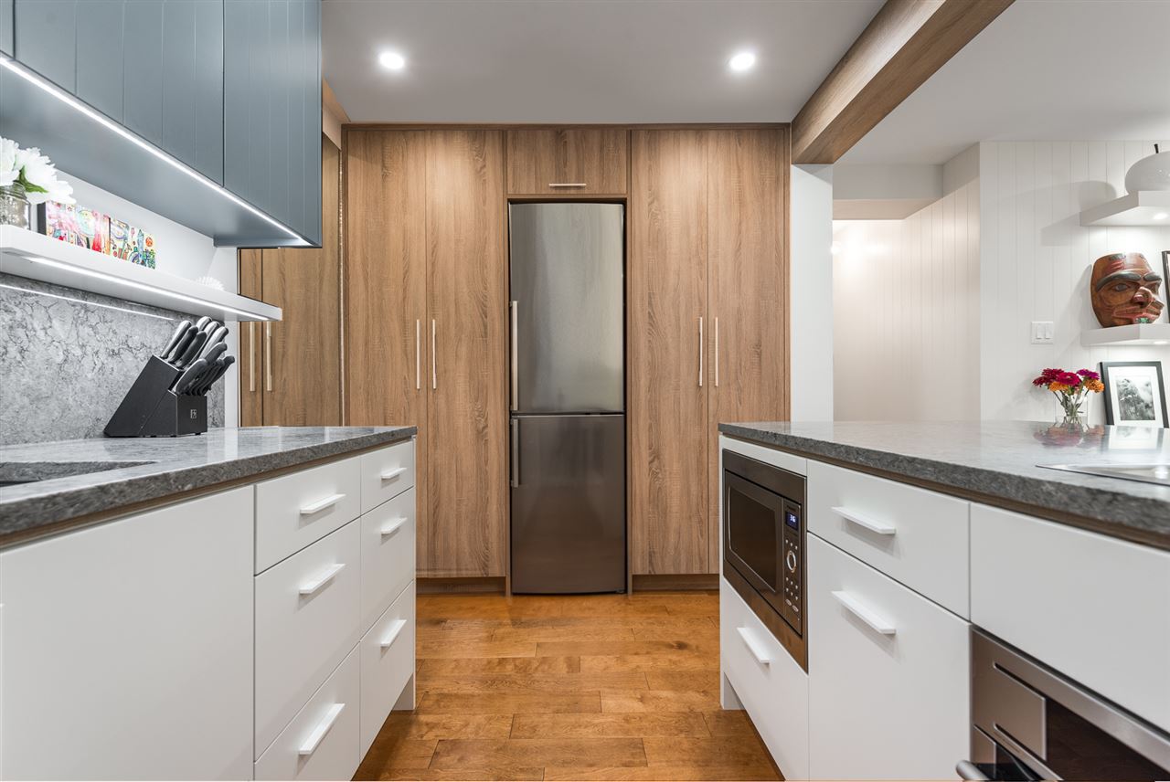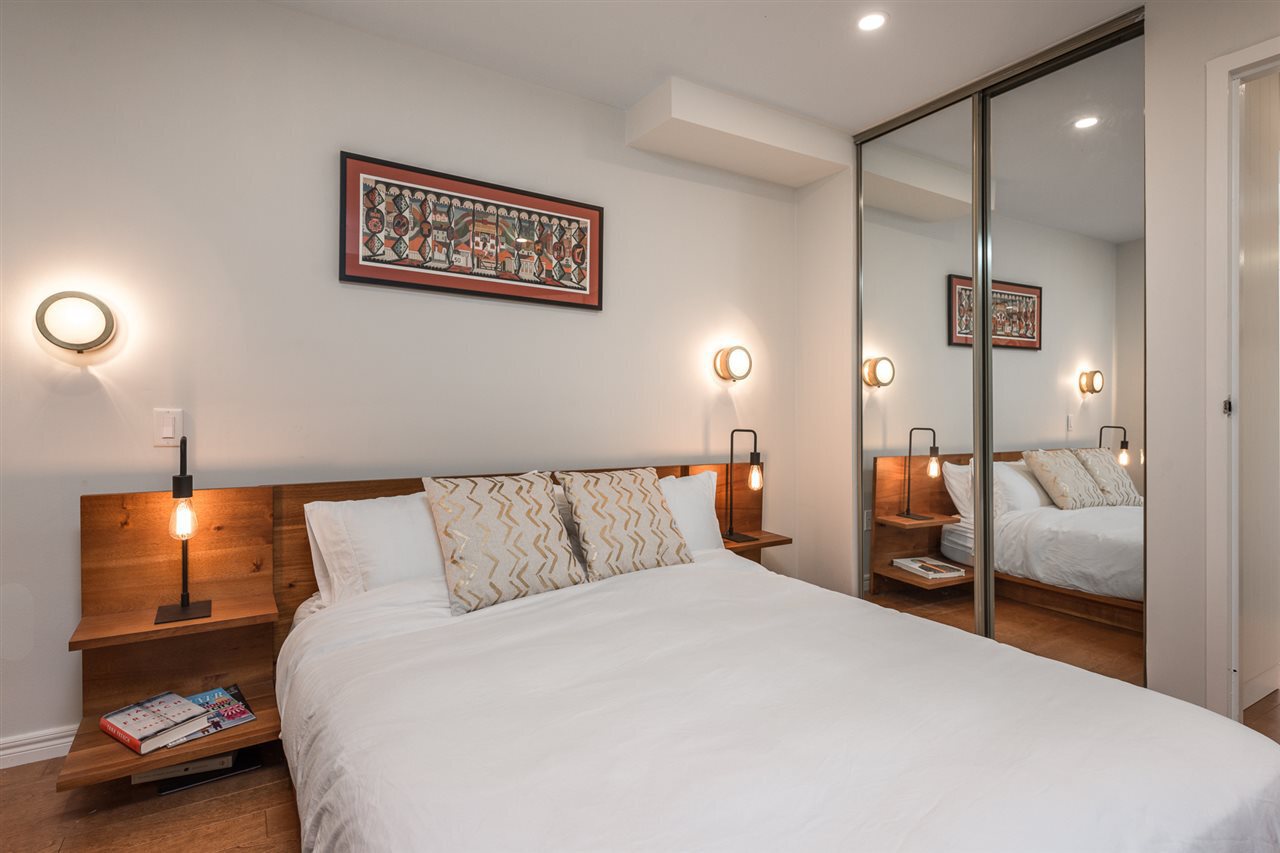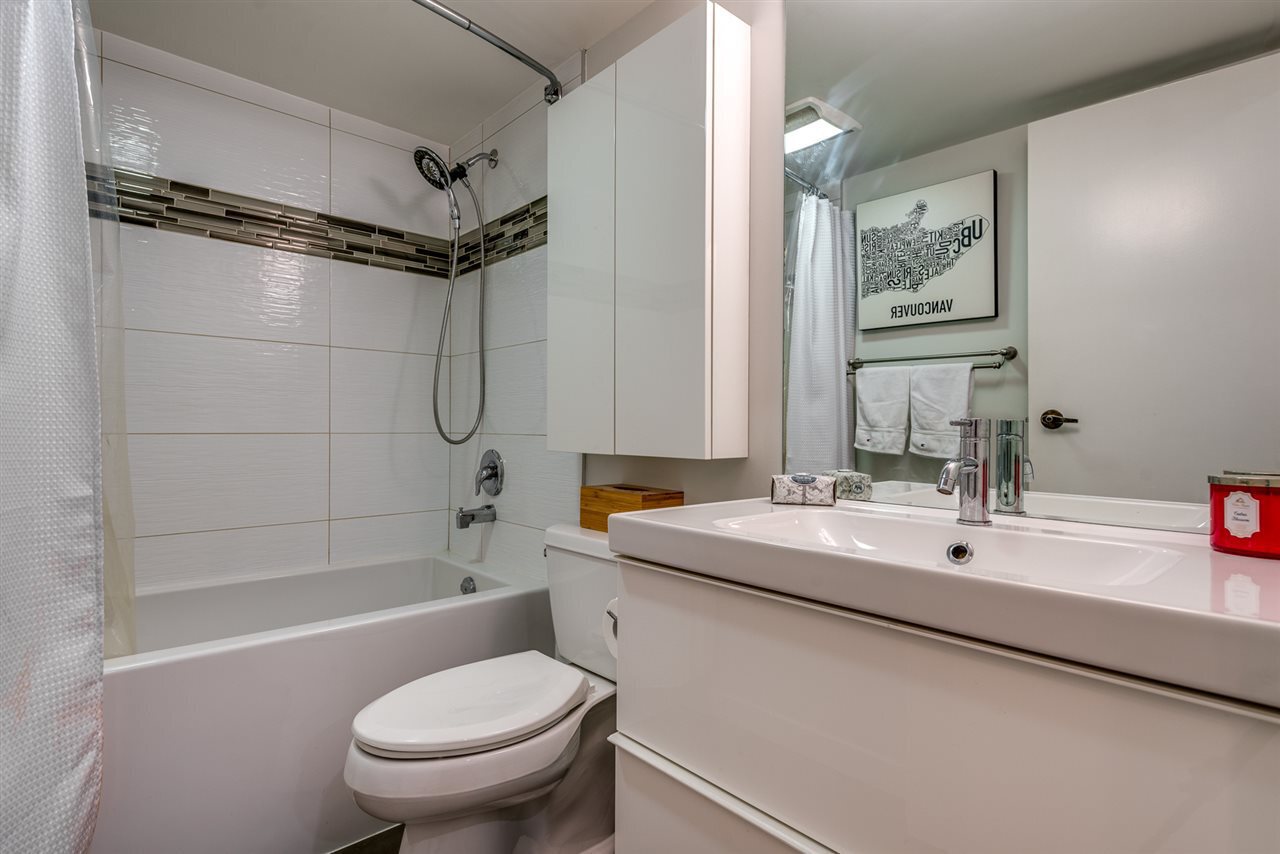 Welcome to the Westport! This oversized 723 sqft 1-bed + large den has undergone a TOTAL interior renovation! Designer updates include: new open kitchen with wood cabinetry, undercabinet lighting, quartz counters and floating shelves, plus all new s/s AEG & Fisher Paykel appliance package including induction cooktop. Enjoy updated bathroom, gleaming engineered hardwood floors throughout, recessed pot lighting, and custom shelving and entertainment center. Work comfortably from home in your large solarium, and relax on your private fully fenced 11 x 10 patio. This fully rainscreened + re-piped complex is short walking distance to all the convenient amenities of the West End. Pets and Rentals welcomed, and complete with 1 parking/1 storage. This one will go fast - call today!