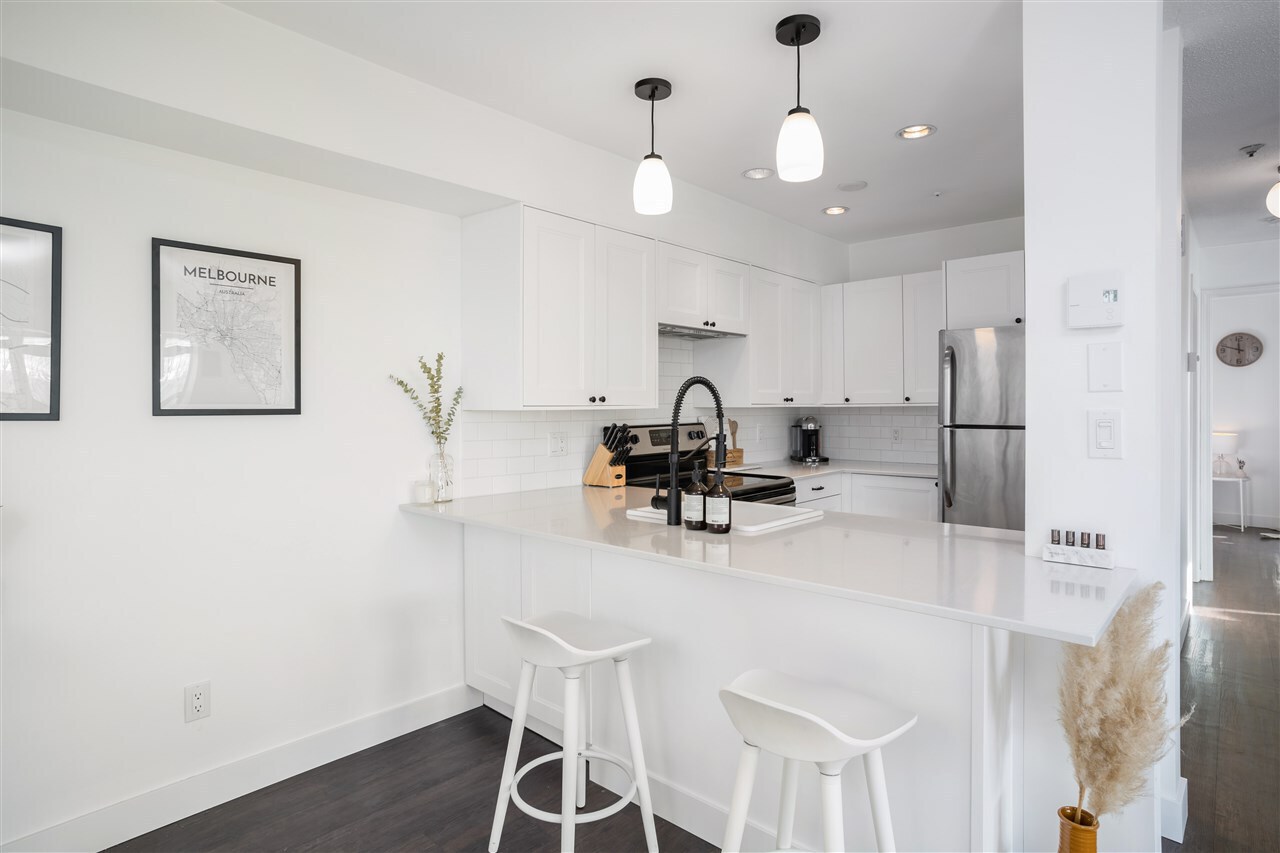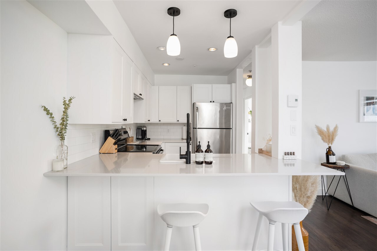 Enjoy panoramic skyline views from this gorgeous 2-bedroom townhome in sought after Willingdon Heights! Step inside to find quaint foyer with large windows on the main, taking you up to your bright Southwest corner home with loads of natural light. Completely redesigned interior features new vinyl flooring, new baseboards & paint, pot lighting and cozy gas fireplace. Enjoy new Chef's kitchen with beautiful quartz counters and shaker cabinetry, subway tile backsplash and s/s appliances. Entertain year round on one of your two main-level balconies or on your covered PRIVATE ROOFTOP deck with outlook to Brentwood Town Centre. Complete with secured parking and storage. Pets and Rentals welcomed w/ restrictions. Don't miss it - call today!