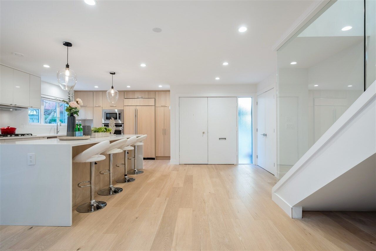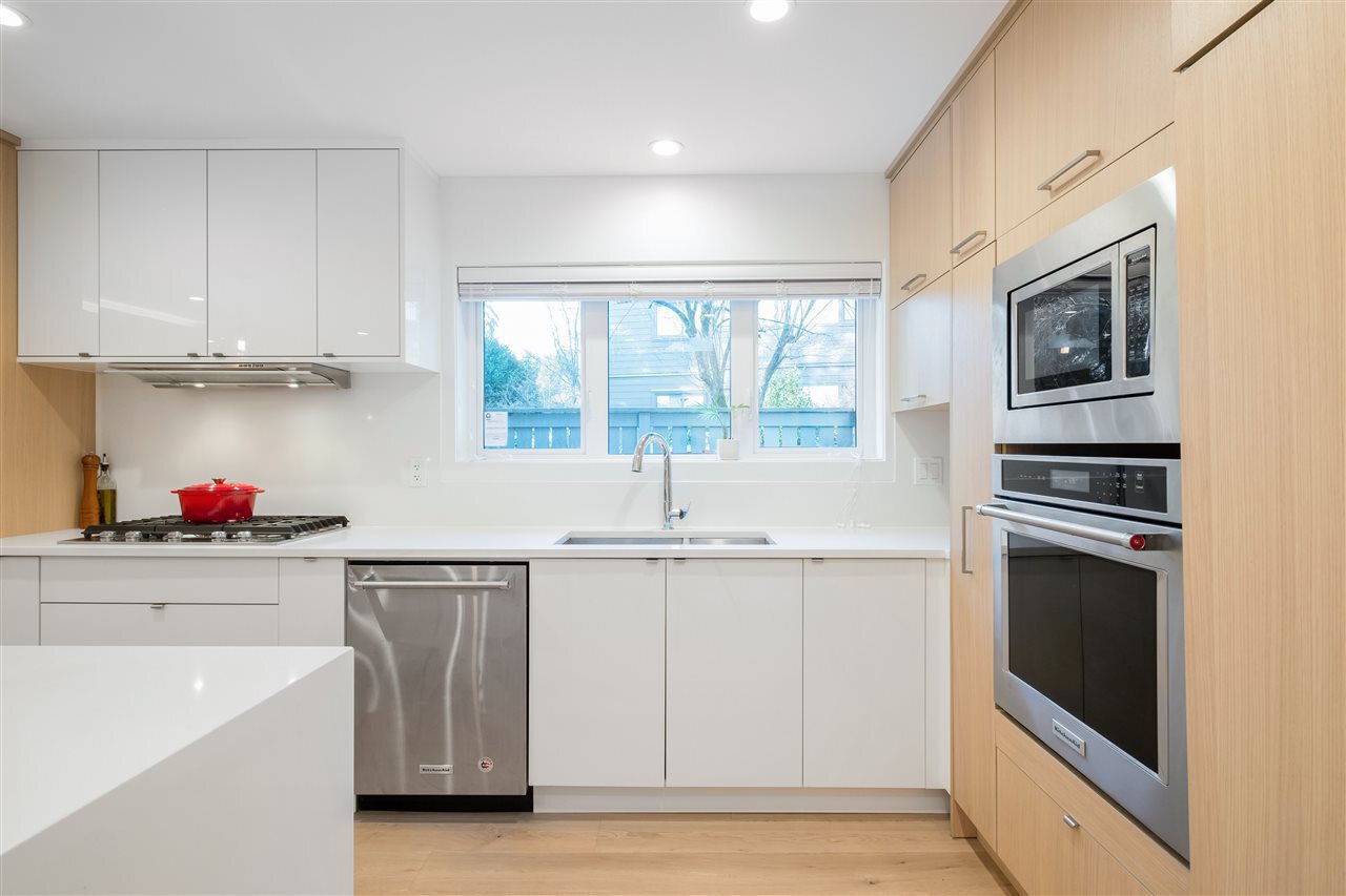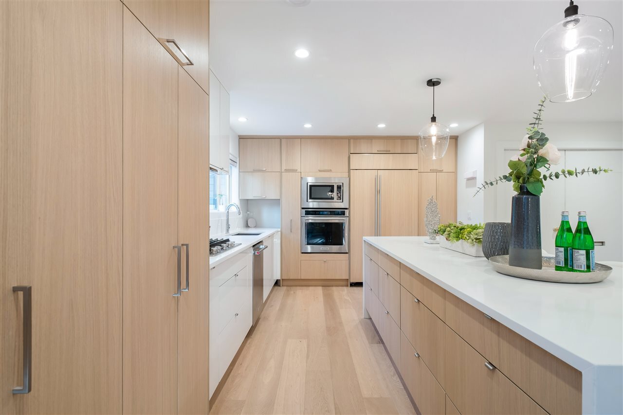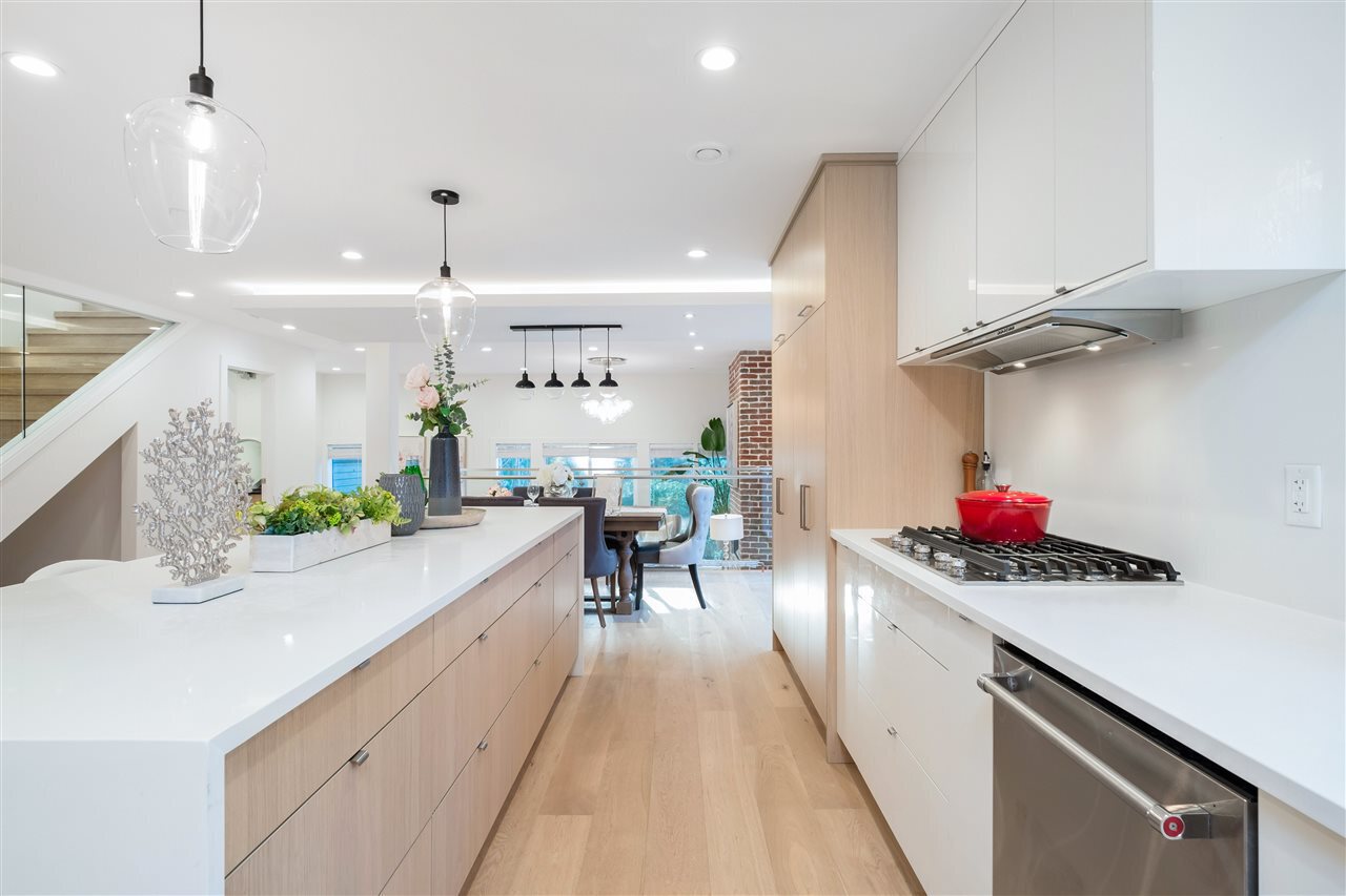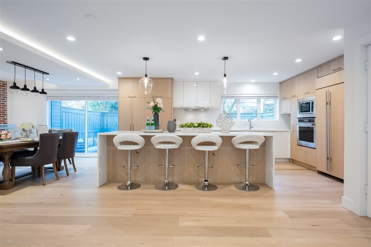 A Renovation Masterpiece. Luxury 2800sqft 5-bedroom townhome boasting CHEF'S DREAM KITCHEN ft massive Sub Zero fridge, s/s KitchenAid appliance pkg incl 5-burner gas range, quartz counters, sleek wood cabinetry, XL kitchen island w/ pendant lighting. No expense spared: White Oak eng hw floors, pot lighting, recessed LED lighting, b/i speakers, designer light fixtures, custom closets, new windows, new plumbing/electrical, new panel, 2 gas fireplaces, Viessmann hot water on demand system.. this isn’t your average renovation. Two HUGE patios surrounded by private grass lawn. Complete with 2 private parking directly outside your door, outdoor pool, loads of storage, and just 2 minutes to 2nd Narrows bridge – this is one you won’t want to miss. Call today for your private appointment!