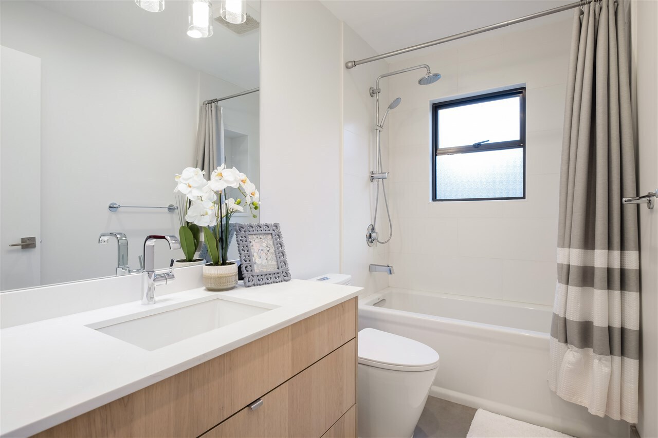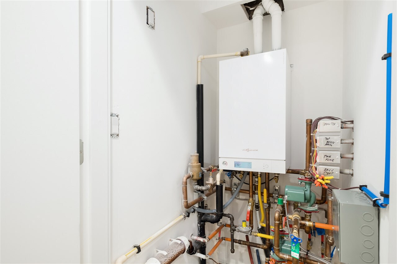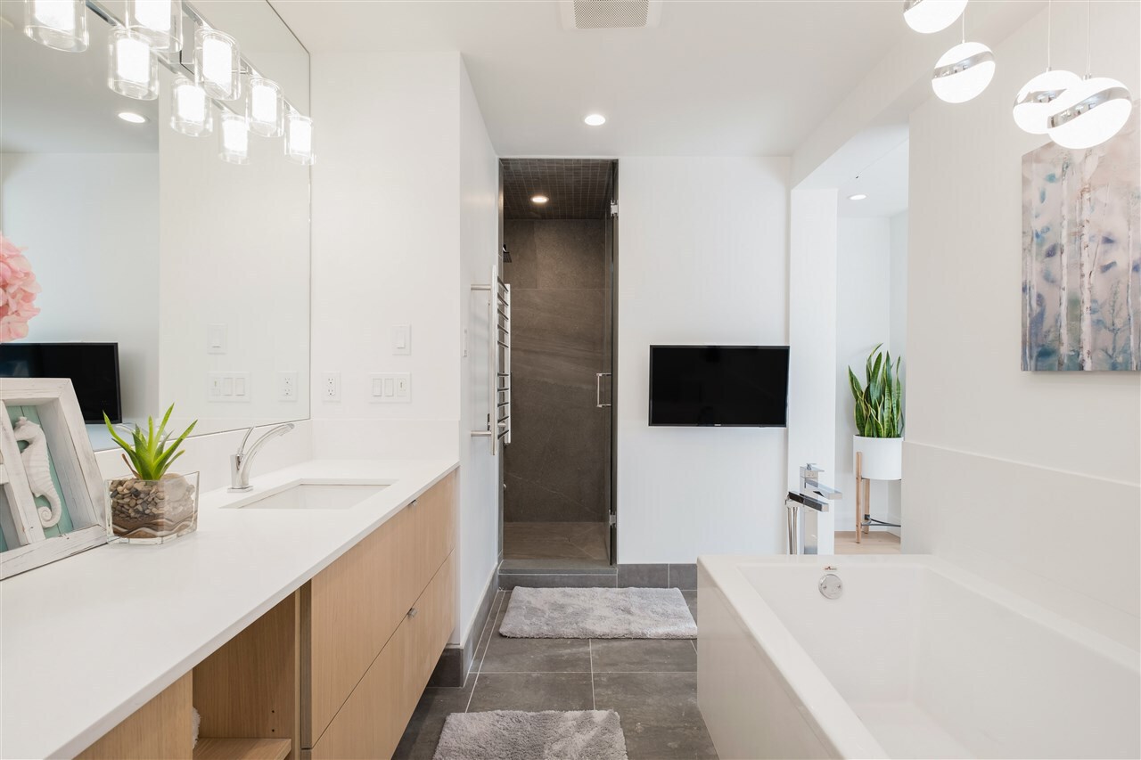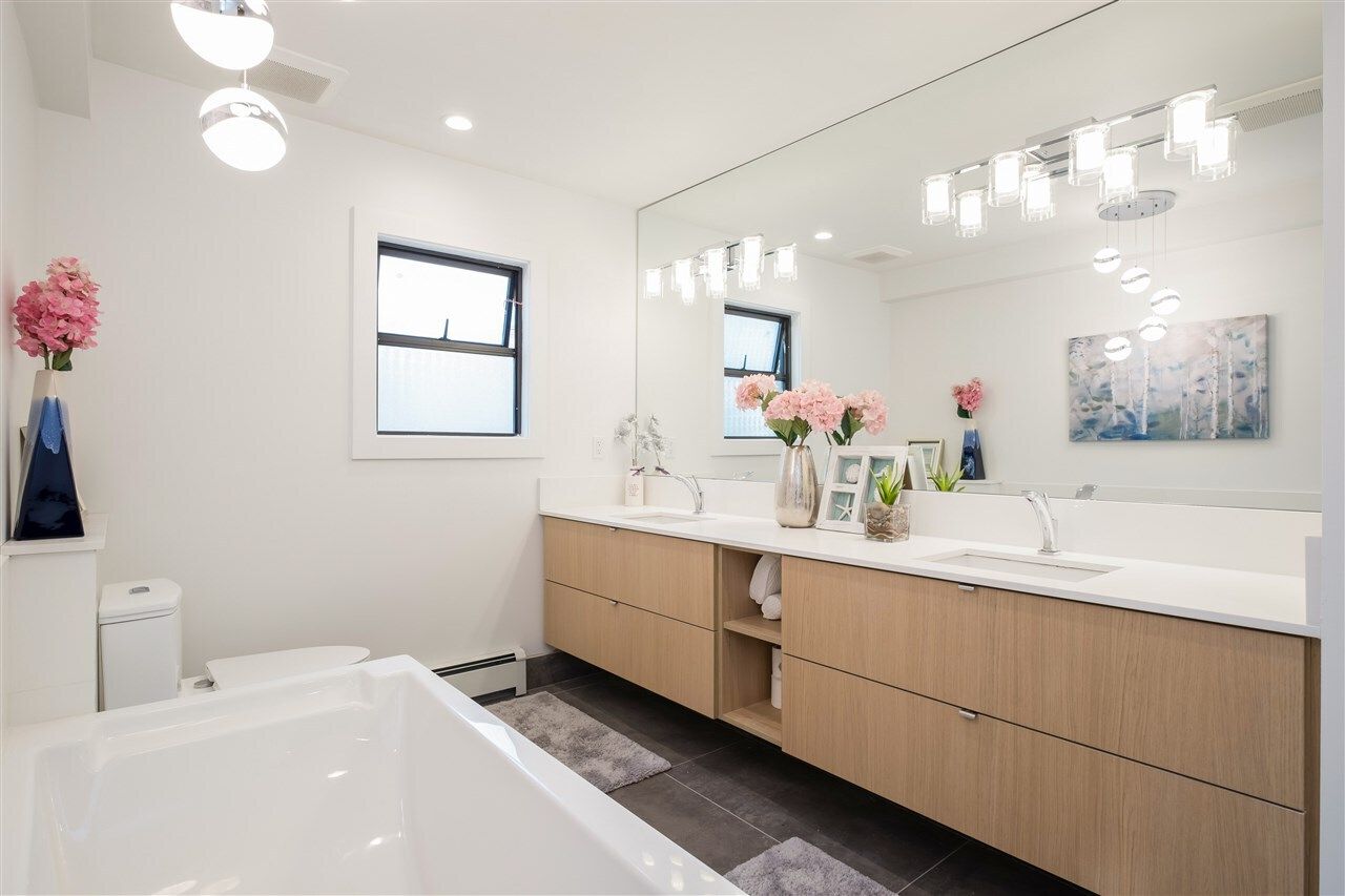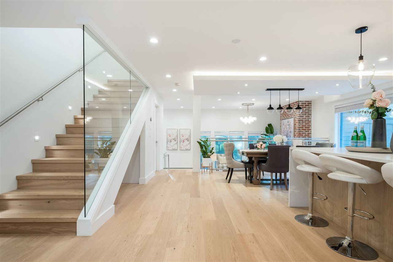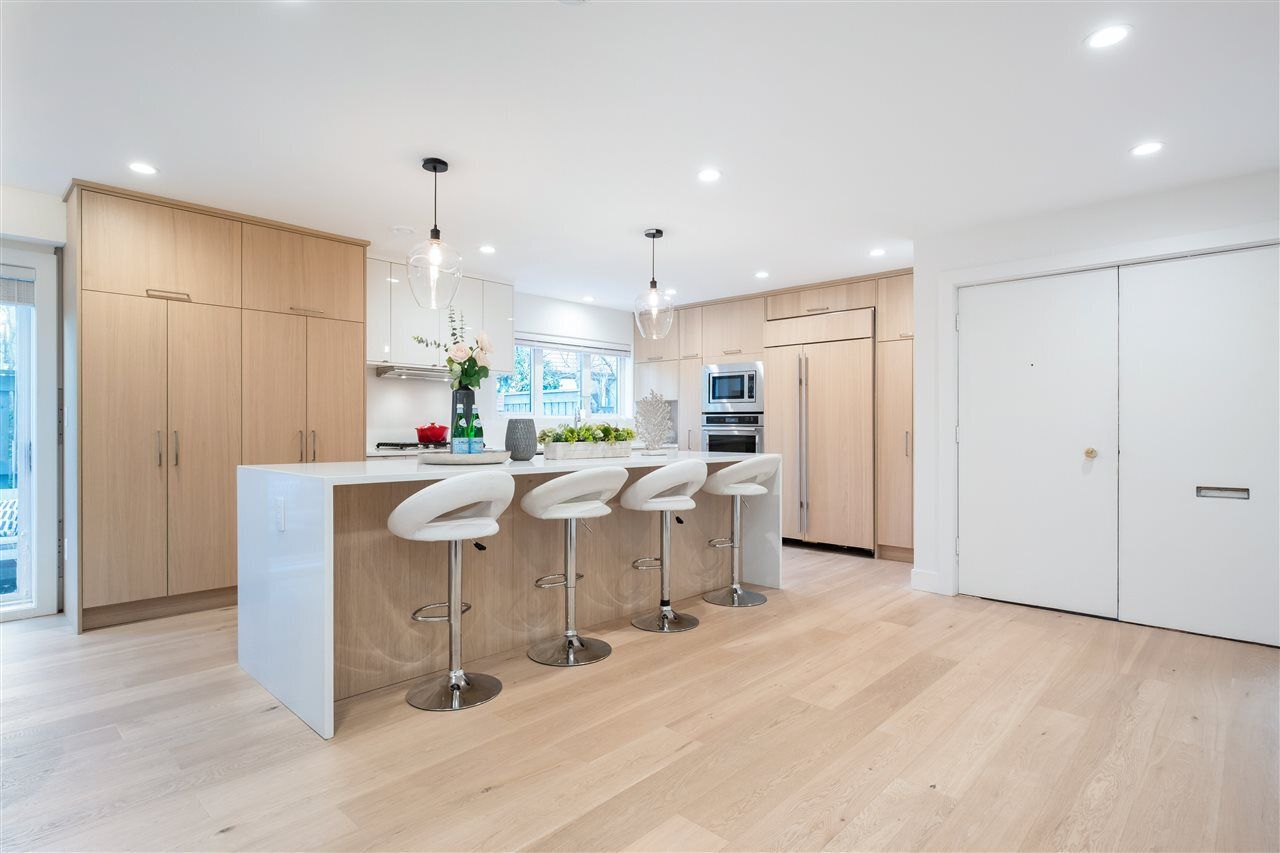 A Renovation Masterpiece. Luxury 2800sqft 5-bedroom townhome boasting CHEF'S DREAM KITCHEN ft massive Sub Zero fridge, s/s KitchenAid appliance pkg incl 5-burner gas range, quartz counters, sleek wood cabinetry, XL kitchen island w/ pendant lighting. No expense spared: White Oak eng hw floors, pot lighting, recessed LED lighting, b/i speakers, designer light fixtures, custom closets, new windows, new plumbing/electrical, new panel, 2 gas fireplaces, Viessmann hot water on demand system.. this isn’t your average renovation. Two HUGE patios surrounded by private grass lawn. Complete with 2 private parking directly outside your door, outdoor pool, loads of storage, and just 2 minutes to 2nd Narrows bridge – this is one you won’t want to miss. Call today for your private appointment!
