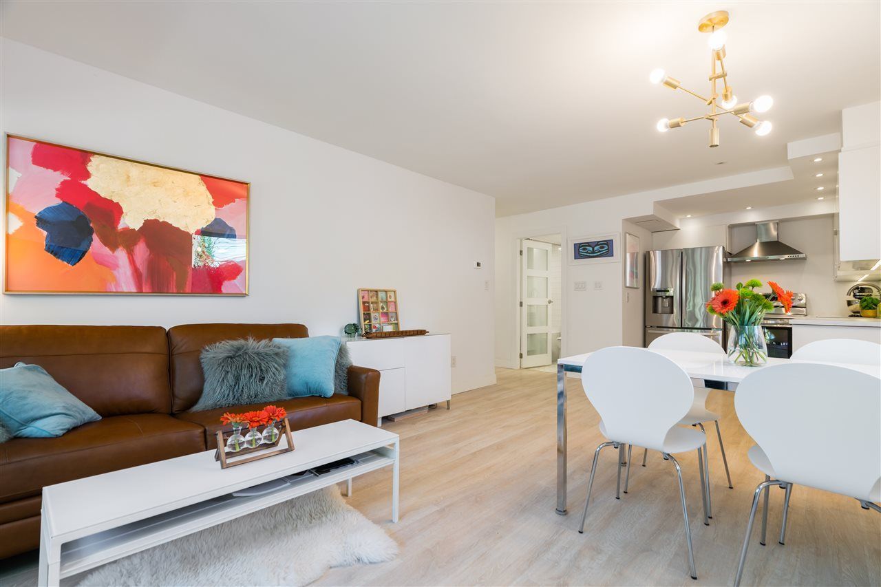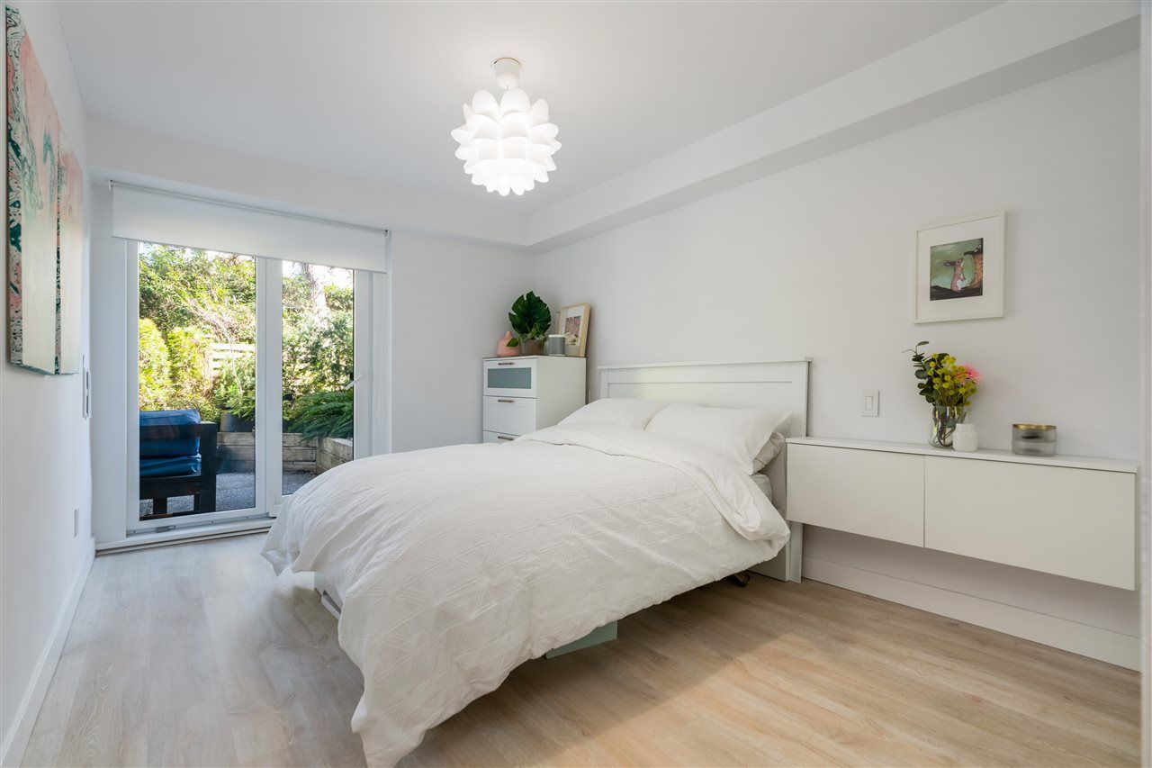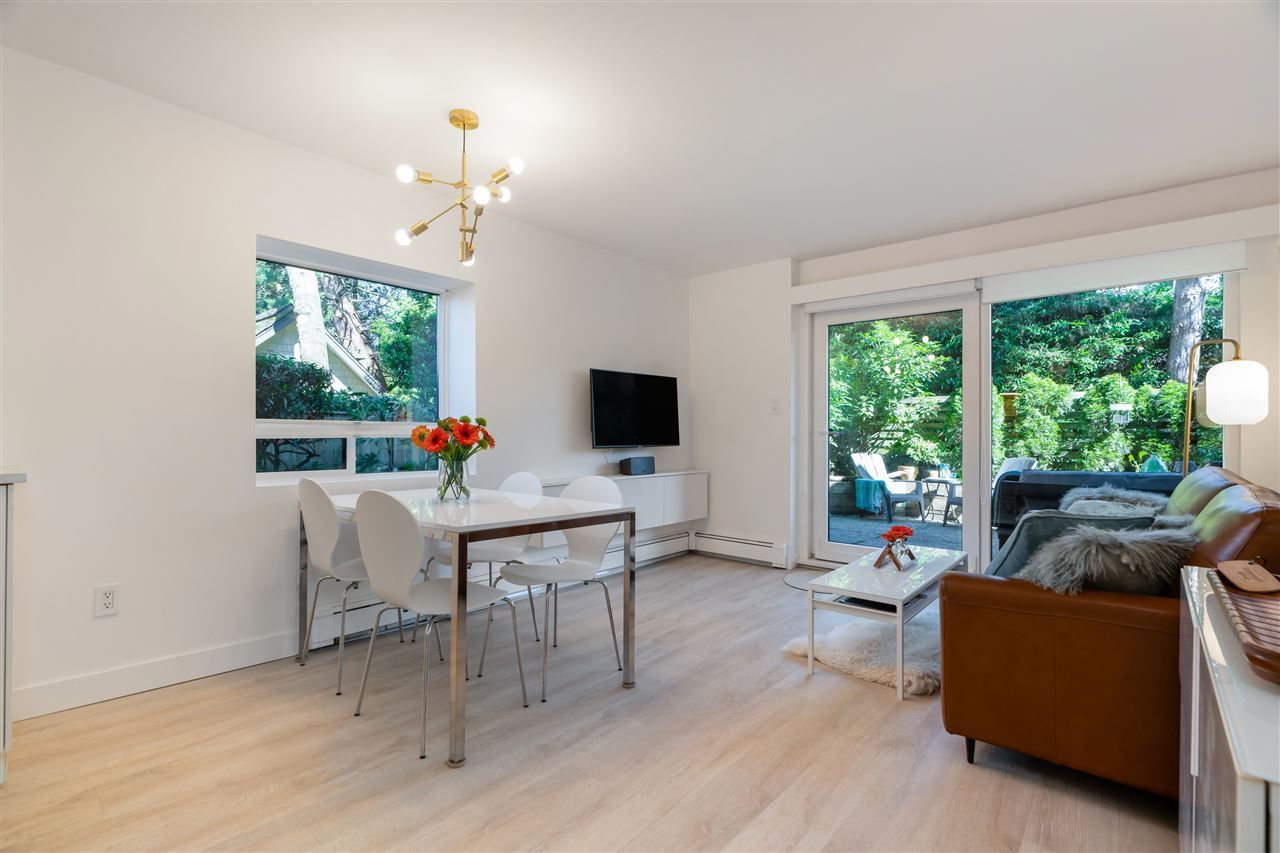 One-of-a-kind entertainer's paradise awaits! Over 1000 sqft of interior/exterior living incl fully fenced ground-level patio ideal for pets, garden lovers, children, or year-round entertainment. Very private corner home boasts townhome-style access and features stunning custom renovation: designer lighting, custom cabinetry, quartz counters, glass backsplash, laminate floors, s/s appliances, new washer/dryer, new drywall, and luxurious new bathroom. Very proactive strata feat upgraded exterior, balconies, and top-of-the-line Euro Tilt patio doors, gym, and south-facing rooftop deck with panoramic city view. Steps to Hamersley Park, the Brewery District, Lower Lonsdale's many great restaurants, shops, and the Seabus. Rentals and pets welcome, 1 pkg, 1 locker. Will not last, call today!