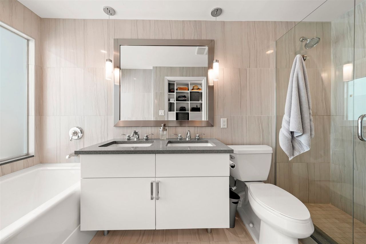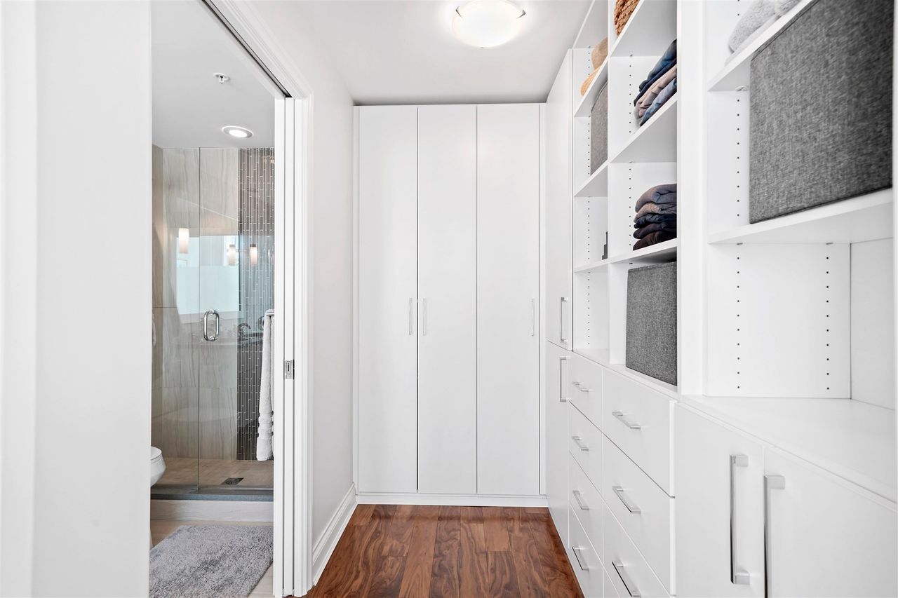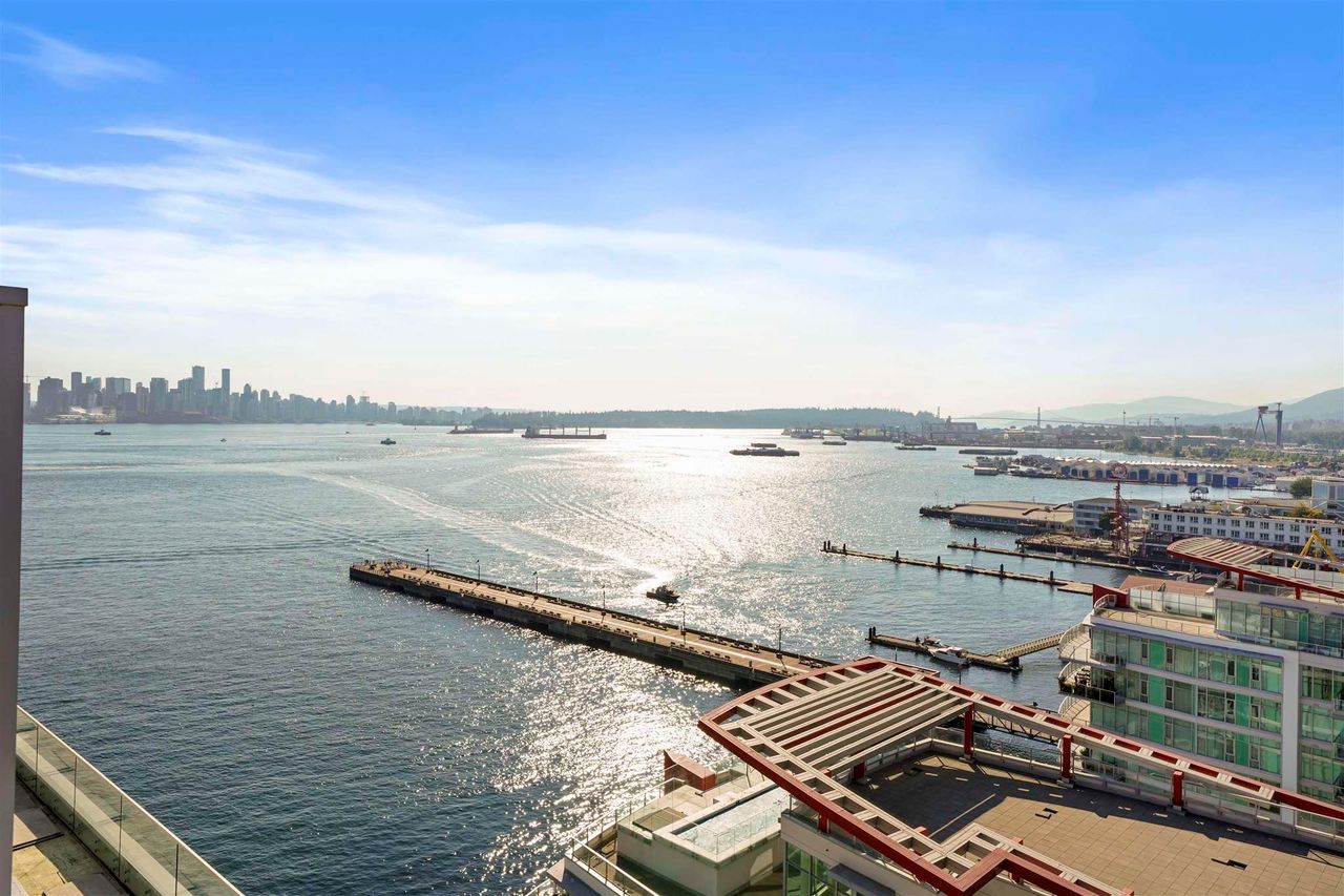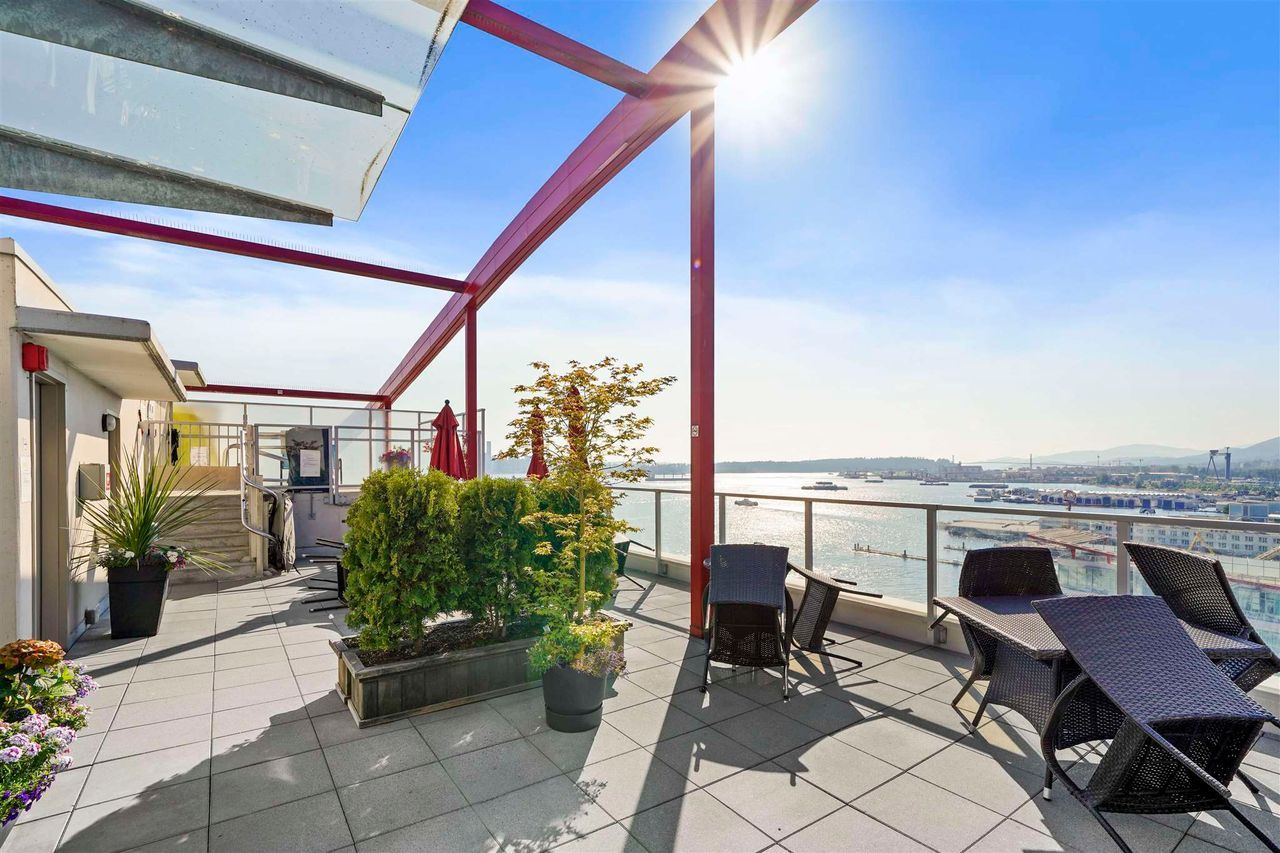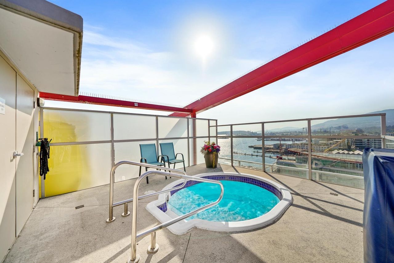 A jewel of a home! You have found an incredible, modern & luxurious home in this large 1-bed & den masterpiece. Located in North Vancouver’s premium location right at the waterfront. This home features vast 14-foot ceilings, A/C, Bosch appliances, Scavolini kitchen, custom wall unit w/ wine bar, queen wall bed & desk, walk-in closet w/ built-ins for clothing/storage, & 2 full baths including a lovely spa-like ensuite. Entertain on the huge patio, w/ private walk-up access or enjoy the incredible roof-top deck w/ hot tub, firepit & BBQ. Included w/ this home is the fitness centre with pool at the Pinnacle Hotel. Truly a lifestyle home just steps away from the excitement, restaurants, entertainment & conveniences of Lower Lonsdale, & a short walk to the Lonsdale Quay market and Seabus.