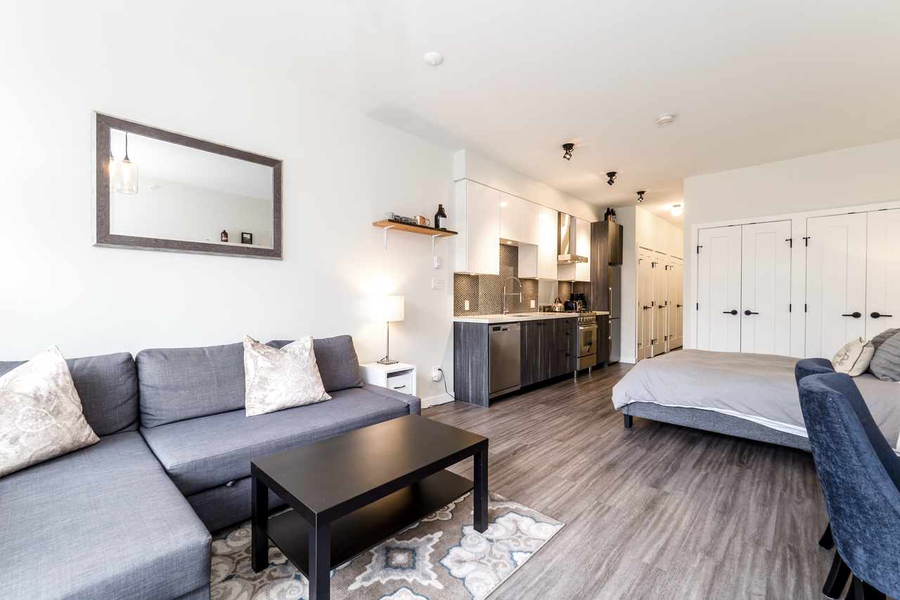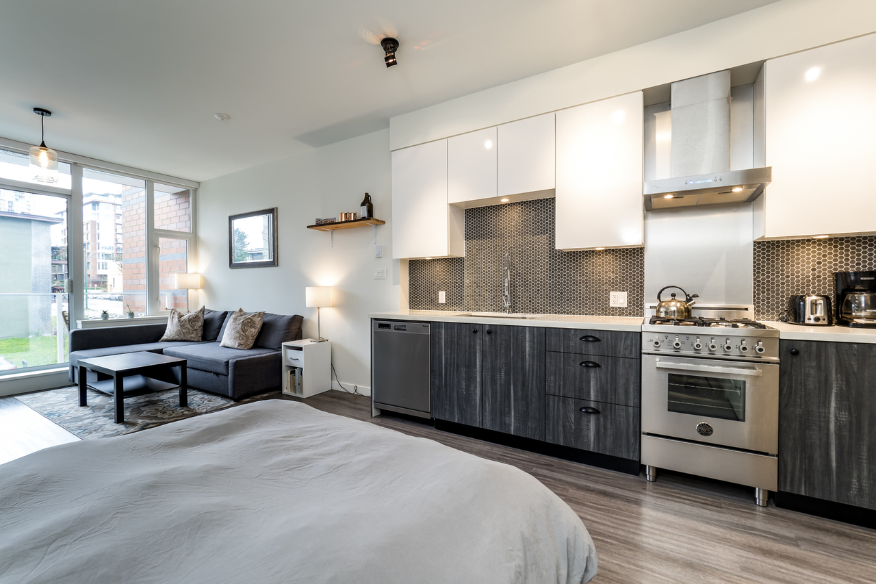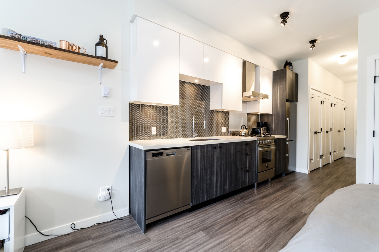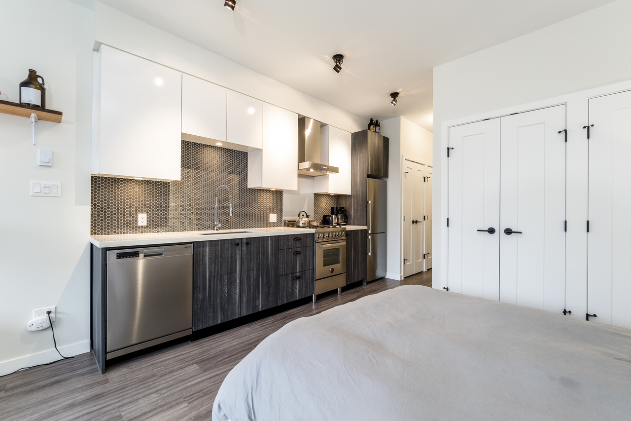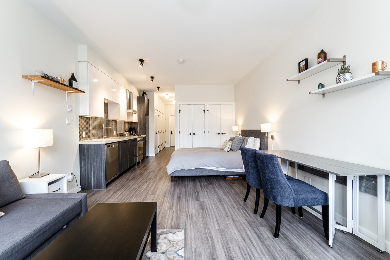 Modern Meets Bohemian in this trendy artist's studio in the heart of the Brewery District off Main. Simply a Stunning Studio + Flex - The open concept plan and 9’ ceilings add to the bright exposure provided by floor-to-ceiling windows, which showcase your BBQ deck. Chef's dream kitchen appliance package incl BERTAZZONI Pro Series Gas Oven Range, Blomberg d/w & fridge, and Venmar Chimney hoodfan. Polished quartz counters, high quality laminate flooring, roller blinds and marble backsplash round out this designer masterpiece. Comes with 1 parking, 1 storage, 2/5/10 warranty, keyless garage & lobby entrance, City View rooftop patio & artist’s workshop. Mistake to miss this one! OPEN THURS 6-7, FRI 10:30-12, SAT & SUN 2-4!