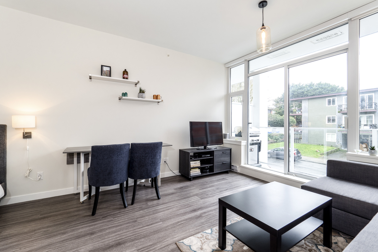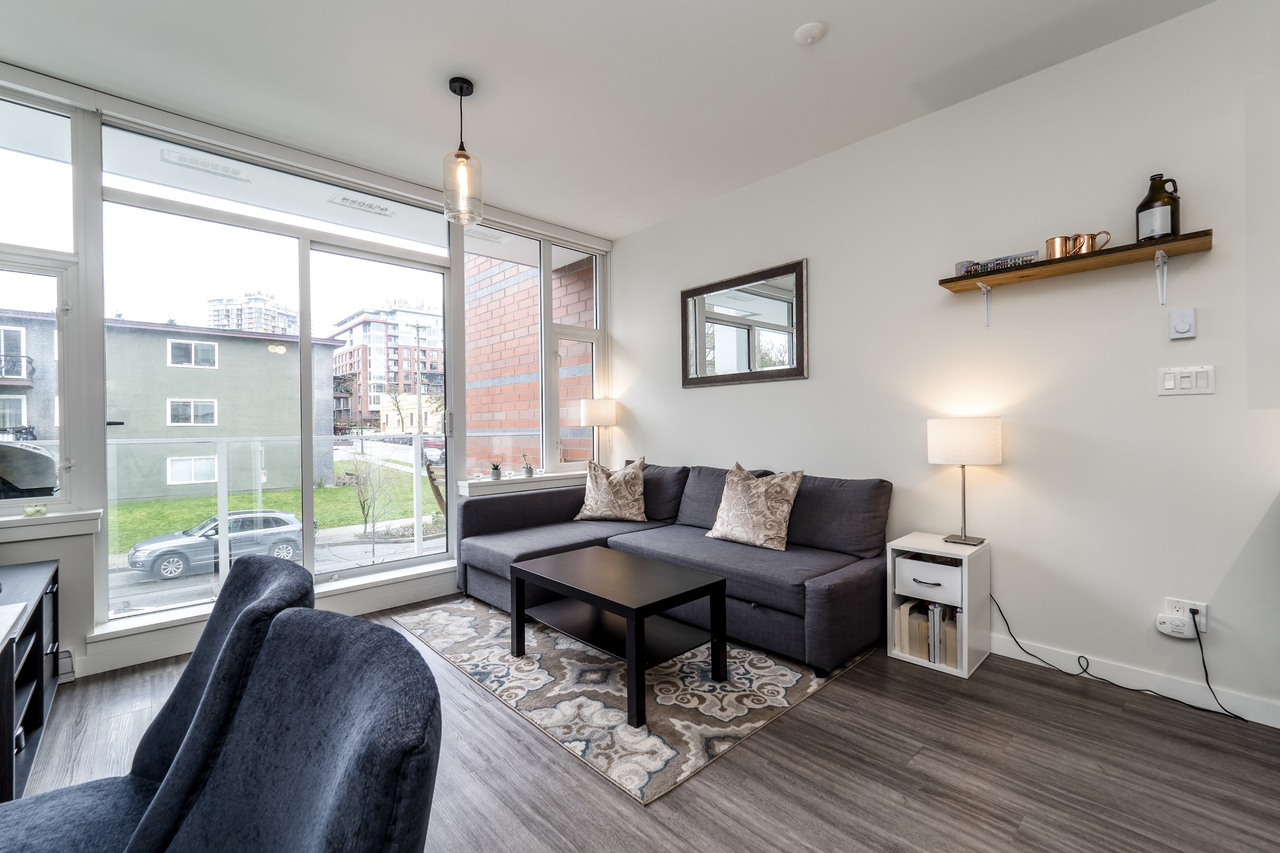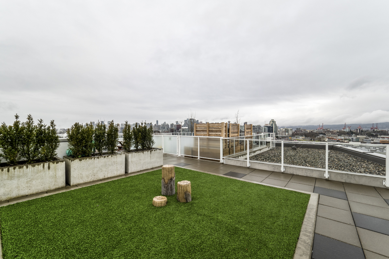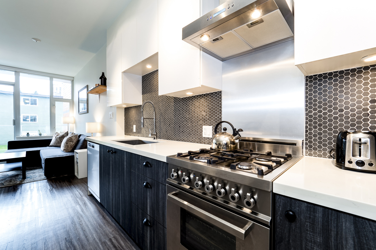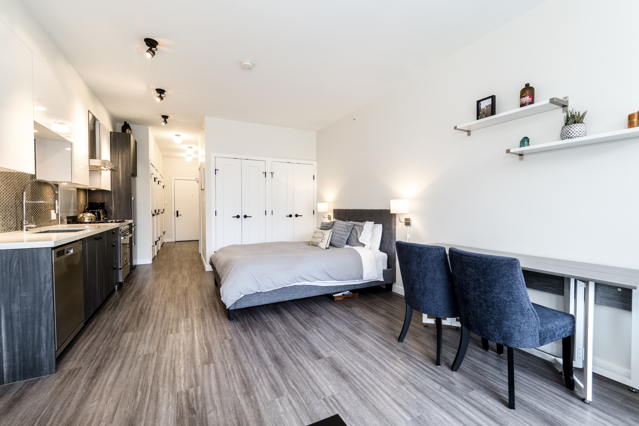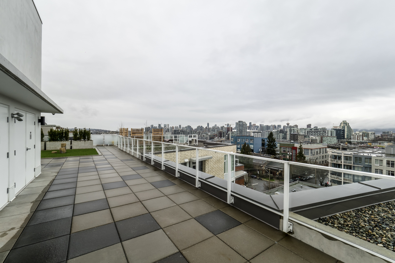 Modern Meets Bohemian in this trendy artist's studio in the heart of the Brewery District off Main. Simply a Stunning Studio + Flex - The open concept plan and 9’ ceilings add to the bright exposure provided by floor-to-ceiling windows, which showcase your BBQ deck. Chef's dream kitchen appliance package incl BERTAZZONI Pro Series Gas Oven Range, Blomberg d/w & fridge, and Venmar Chimney hoodfan. Polished quartz counters, high quality laminate flooring, roller blinds and marble backsplash round out this designer masterpiece. Comes with 1 parking, 1 storage, 2/5/10 warranty, keyless garage & lobby entrance, City View rooftop patio & artist’s workshop. Mistake to miss this one! OPEN THURS 6-7, FRI 10:30-12, SAT & SUN 2-4!