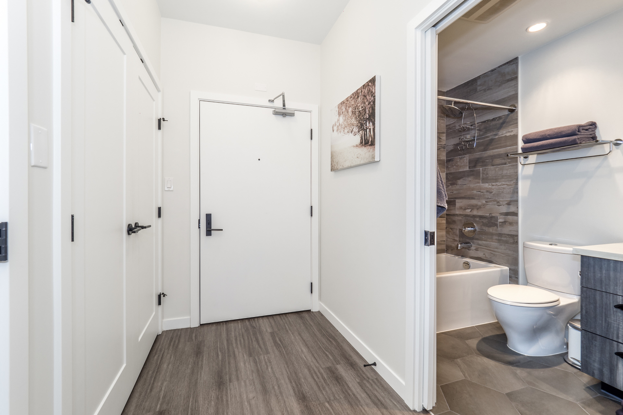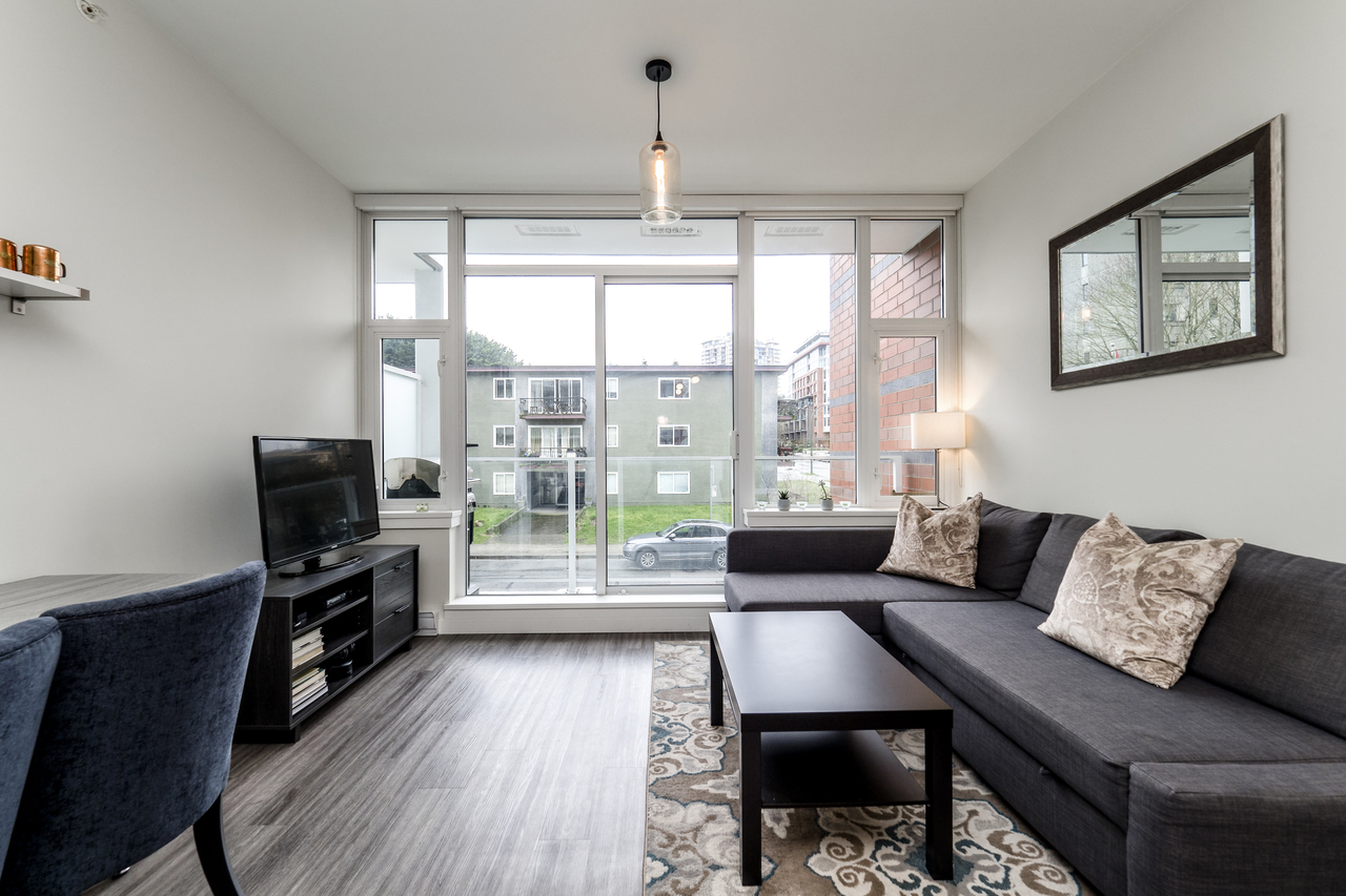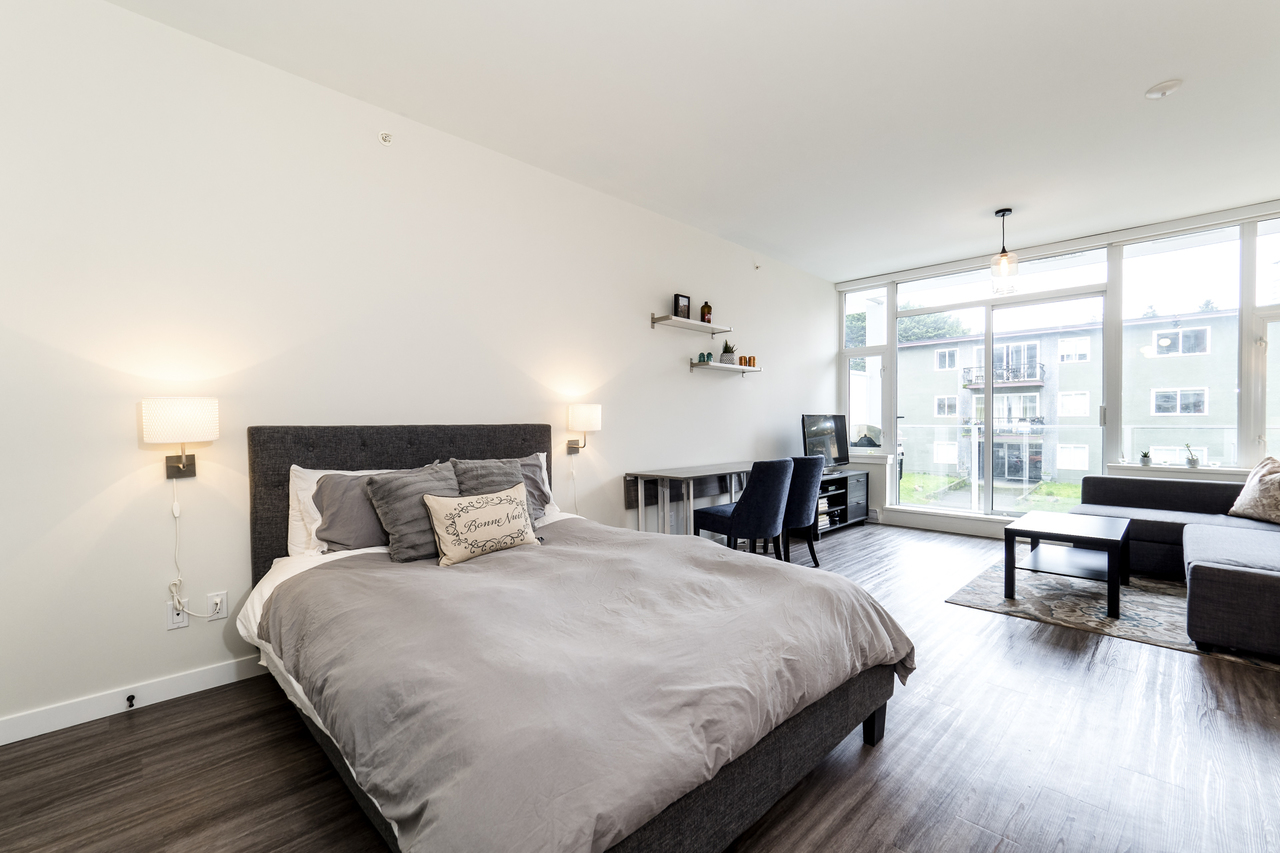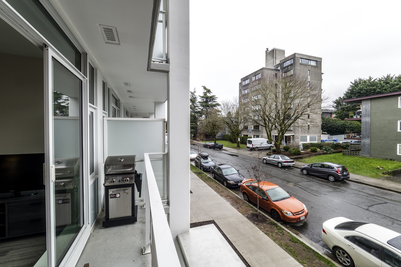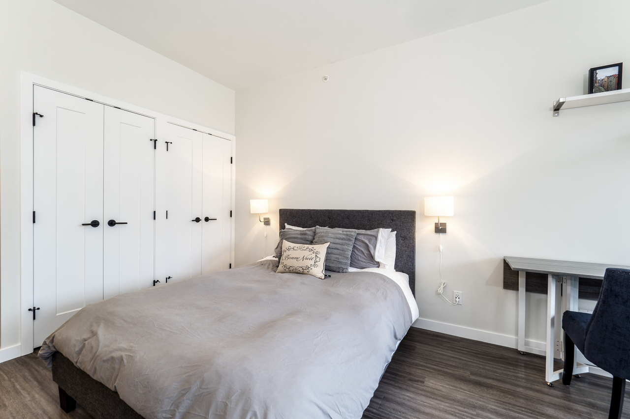 Modern Meets Bohemian in this trendy artist's studio in the heart of the Brewery District off Main. Simply a Stunning Studio + Flex - The open concept plan and 9’ ceilings add to the bright exposure provided by floor-to-ceiling windows, which showcase your BBQ deck. Chef's dream kitchen appliance package incl BERTAZZONI Pro Series Gas Oven Range, Blomberg d/w & fridge, and Venmar Chimney hoodfan. Polished quartz counters, high quality laminate flooring, roller blinds and marble backsplash round out this designer masterpiece. Comes with 1 parking, 1 storage, 2/5/10 warranty, keyless garage & lobby entrance, City View rooftop patio & artist’s workshop. Mistake to miss this one! OPEN THURS 6-7, FRI 10:30-12, SAT & SUN 2-4!