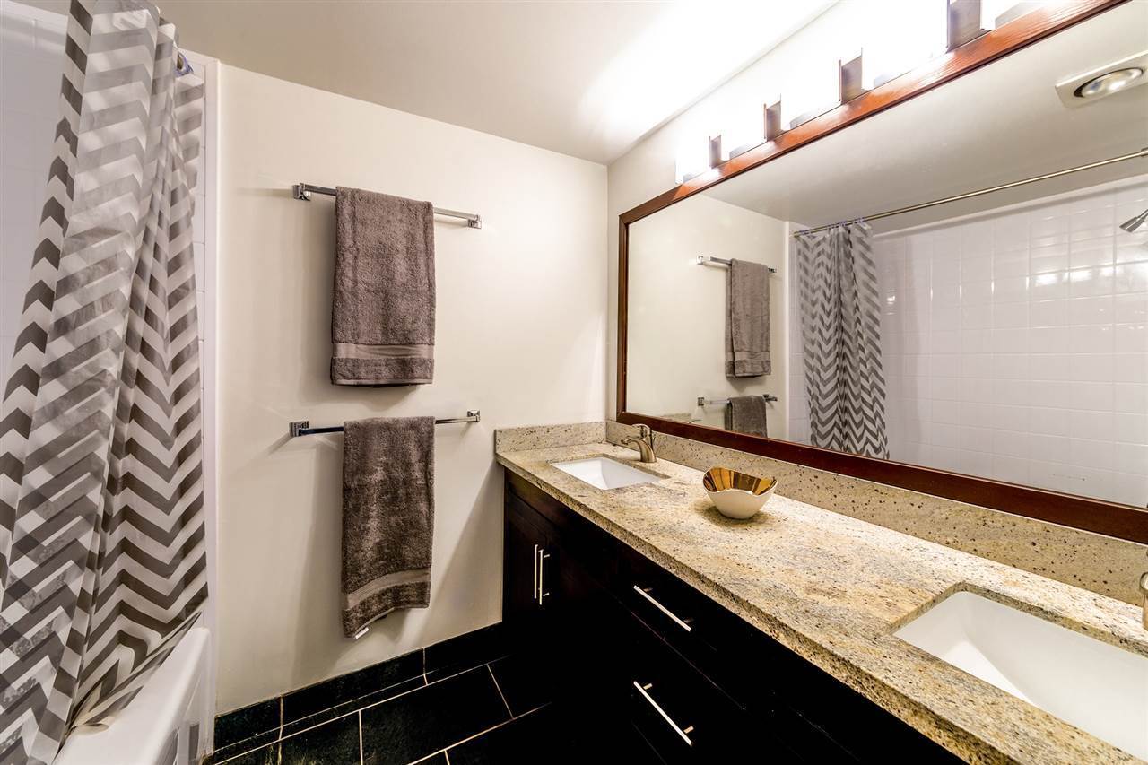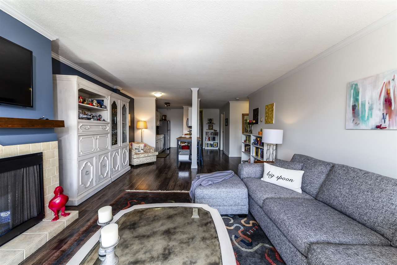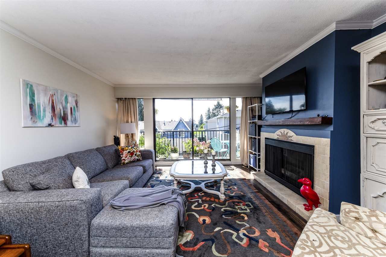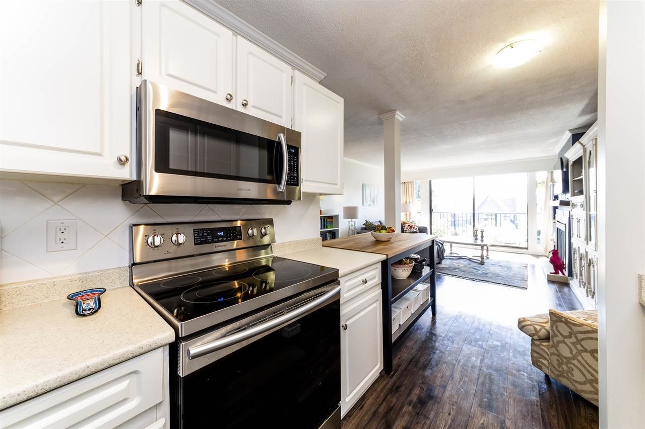 Don't miss this 900+ sq ft one bedroom + den suite at the Lexington! This bright and peaceful home features an open concept living space with many updates incl engineered hw flooring, new s/s appliances, crown mouldings, paint, renovated 5 pce bath with granite counters and double sinks, gas F/P, and much more! Step outside onto your large, quiet deck w/ partial city and mountain views. Very conveniently located steps to transit, shopping and recreation, and 30 secs to HWY 1. Add a well managed bldg and you have the total package! Pets allowed, so hurry!