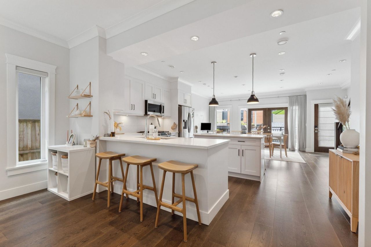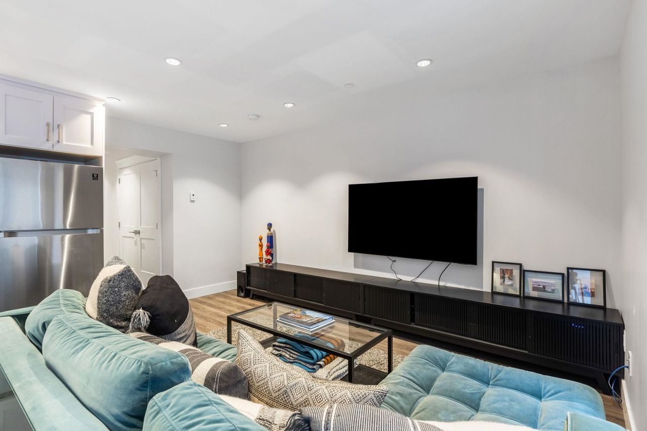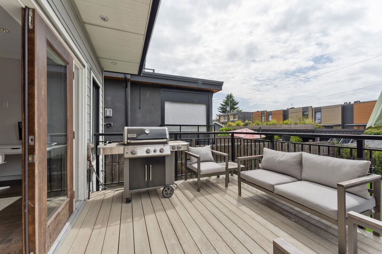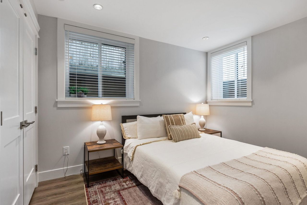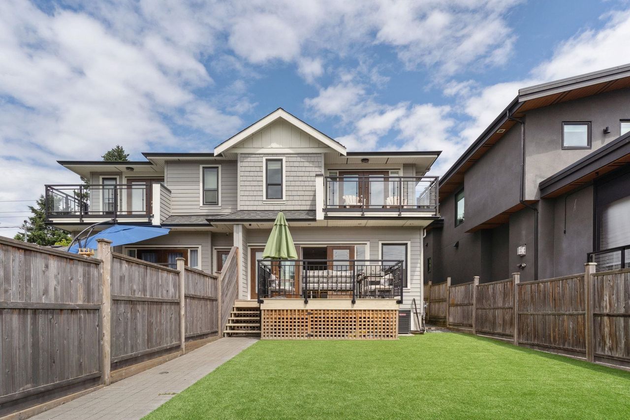 Stunning 2538ft Lower Lonsdale duplex by Rock Arc Development! Nestled on quiet 4th Street, this 5-bedroom, 4-bathroom residence spans 3 levels boasting wide open floorplan with stone countertops, stainless steel appliances, spacious kitchen with French doors leading to cedar deck and sunny south-facing private artificial turf yard. Enjoy beautiful hardwood floors, cozy gas fireplace, radiant heating, HRV, A/C, garage with covered carport, and rear lane access. Lower level hosts sizable legal 2-bedroom suite with its own entrance and patio - ideal for family members or mortgage helper. Enjoy peace of mind with 2-5-10 warranty. No restrictions, bylaws, maintenance fees or GST. Walk to Lonsdale Quay, restaurants and breweries, and incoming coffee and retail at Innova. Call today!
