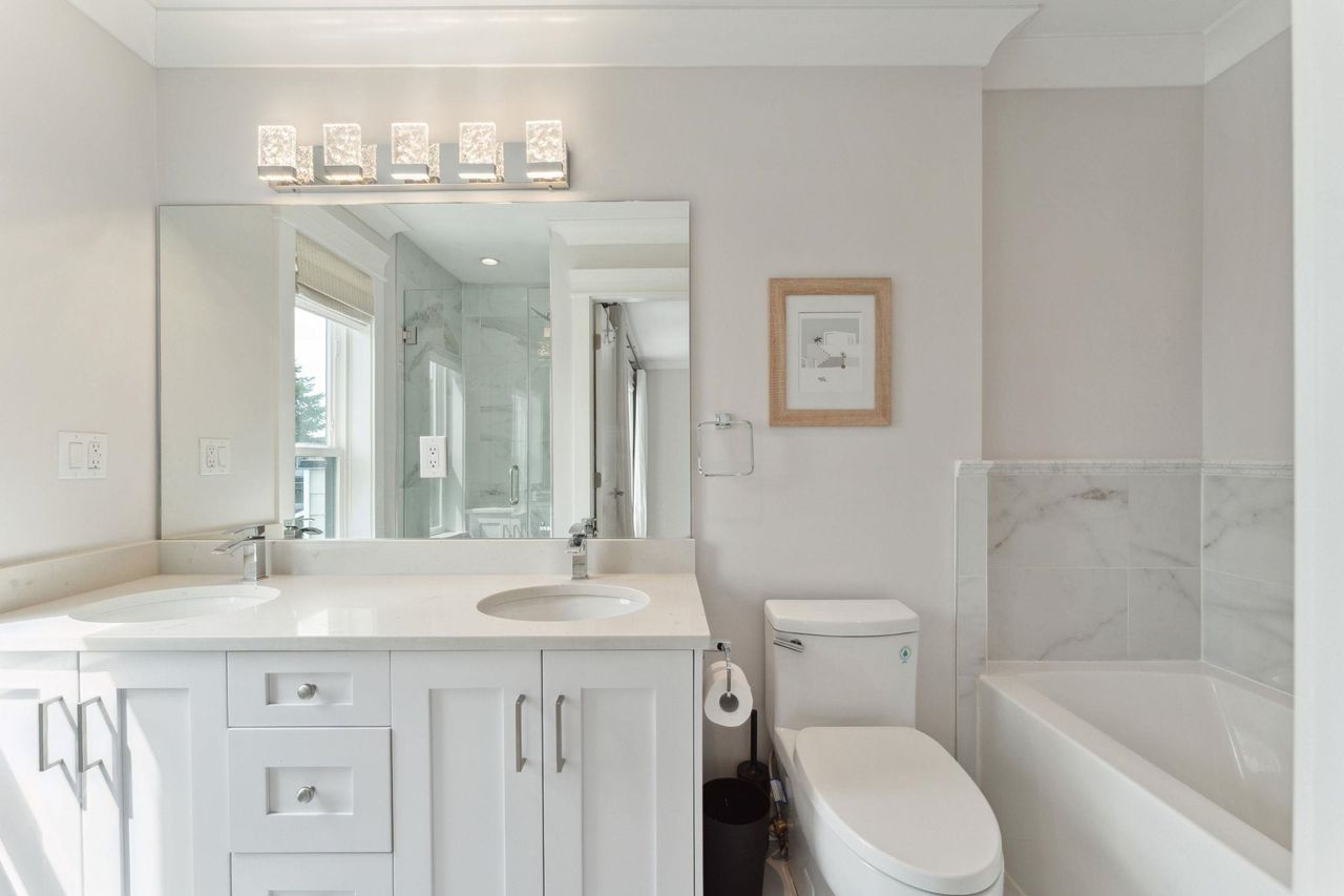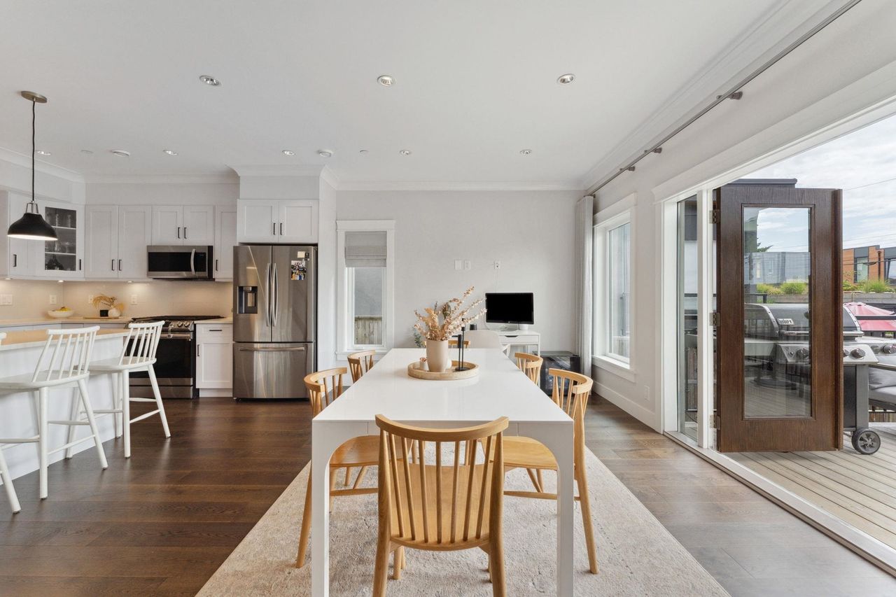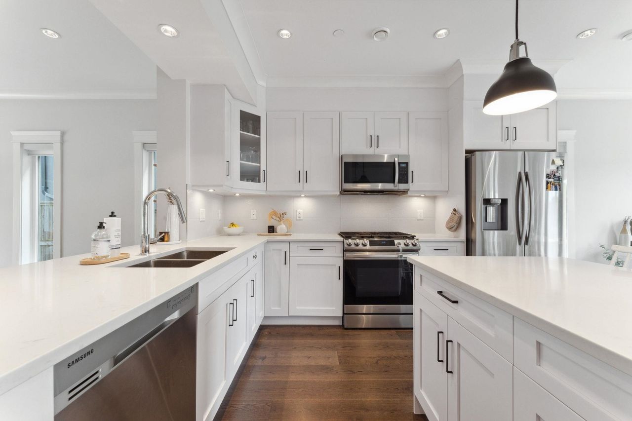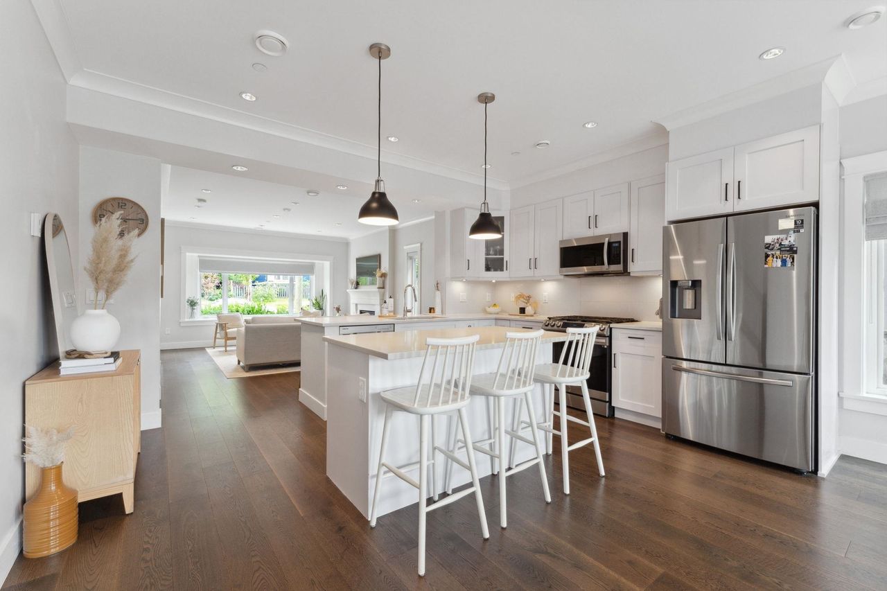 Stunning 2538ft Lower Lonsdale duplex by Rock Arc Development! Nestled on quiet 4th Street, this 5-bedroom, 4-bathroom residence spans 3 levels boasting wide open floorplan with stone countertops, stainless steel appliances, spacious kitchen with French doors leading to cedar deck and sunny south-facing private artificial turf yard. Enjoy beautiful hardwood floors, cozy gas fireplace, radiant heating, HRV, A/C, garage with covered carport, and rear lane access. Lower level hosts sizable legal 2-bedroom suite with its own entrance and patio - ideal for family members or mortgage helper. Enjoy peace of mind with 2-5-10 warranty. No restrictions, bylaws, maintenance fees or GST. Walk to Lonsdale Quay, restaurants and breweries, and incoming coffee and retail at Innova. Call today!