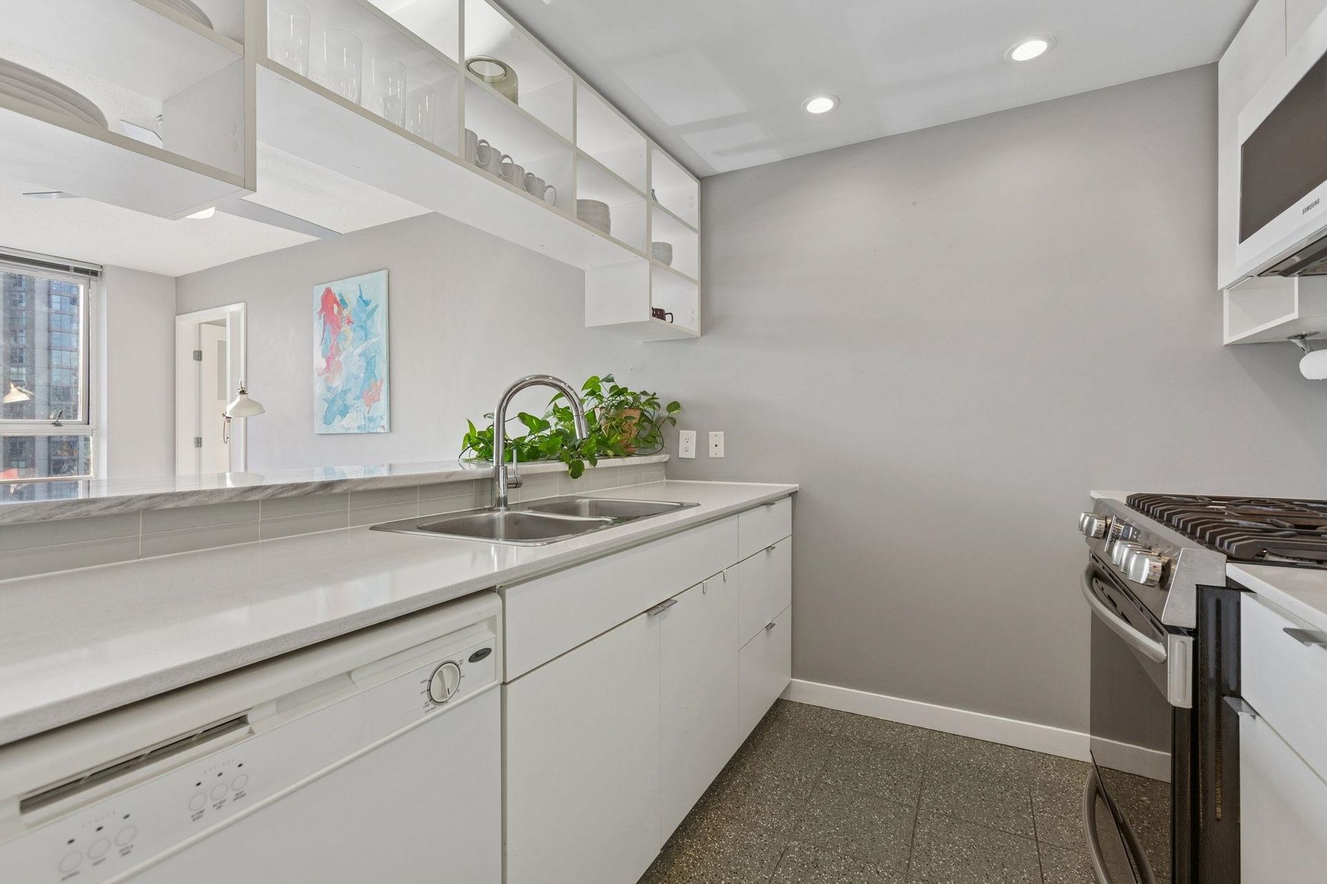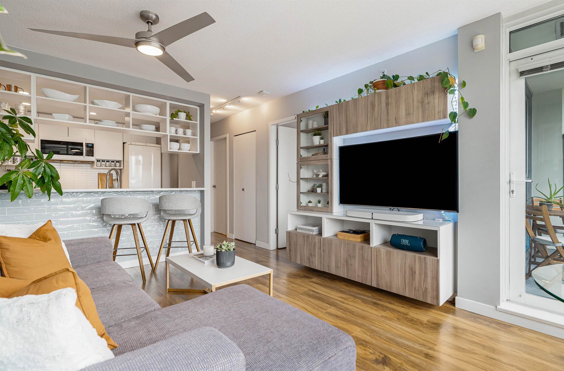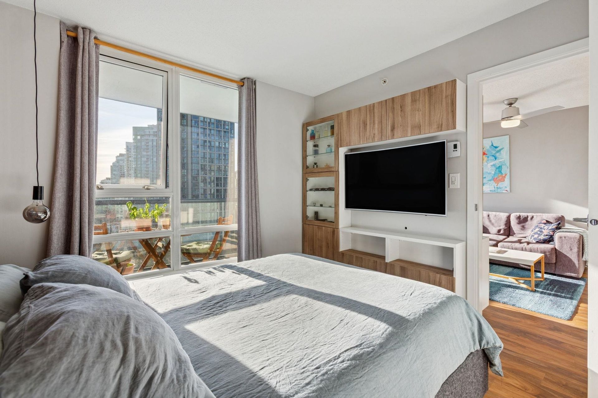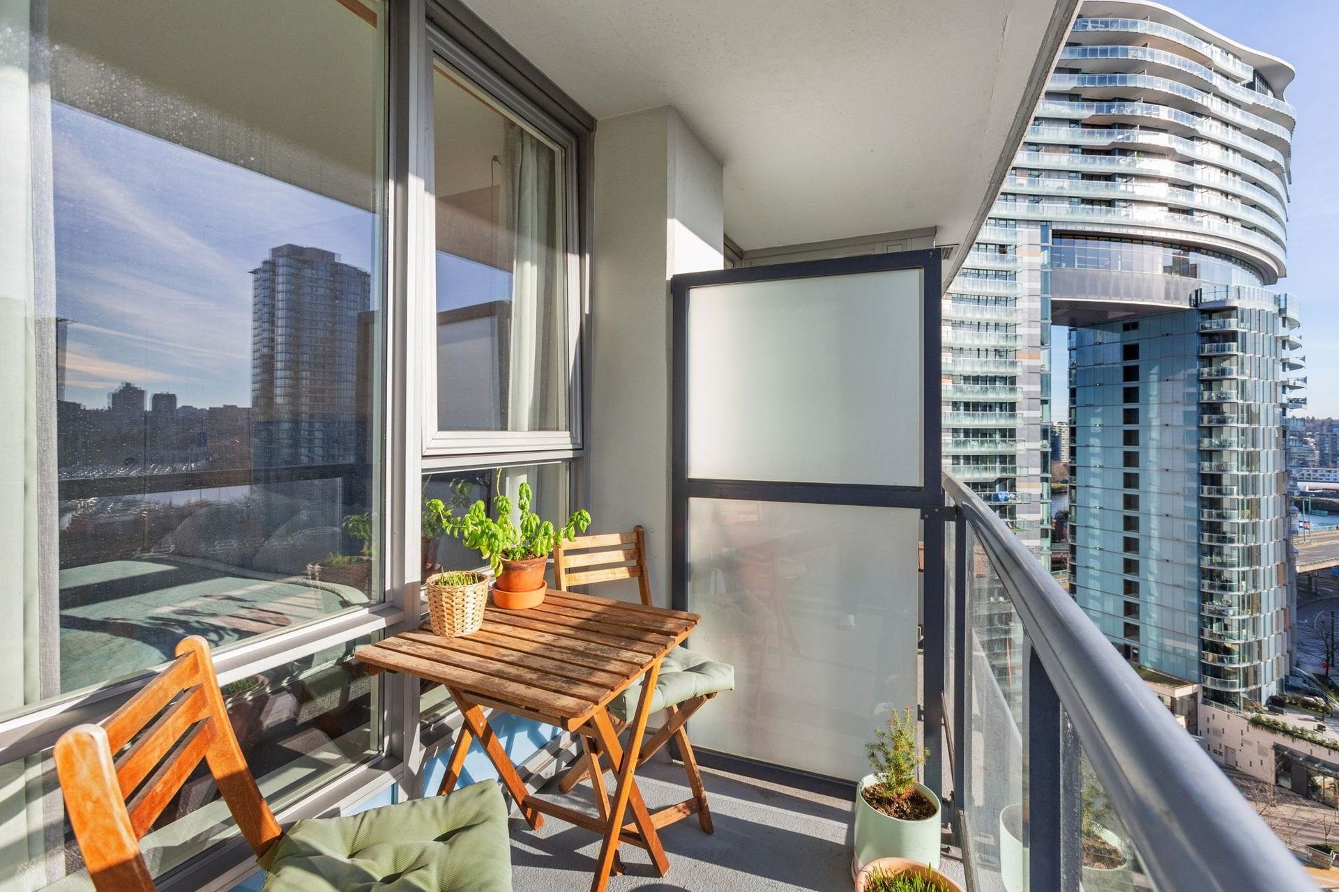 Space where you need it. Location where you want it. Bright and spacious 1 bed + den + bonus flex home with a layout that can’t be beat. South-facing floor-to-ceiling windows fill the home w/ natural light and connect seamlessly to the large, covered patio, extending your living space year-round. Wide plank laminate flooring, wood panel accent walls, marble + quartz counters, granite vanity, and extensive custom built-ins w/ LED lighting. Recently refreshed w/ new paint, stove, washer/dryer, microwave and garburator. Outstanding amenities: concierge, pool, hot tub, sauna /steam, gym, media room, party room, billiards lounge, visitor parking, and bike room. Steps to the seawall, SkyTrain, Rogers Arena, BC Place and vibrant Yaletown core. Pets/Rentals welcome, 1 parking/1 storage. Call now!
